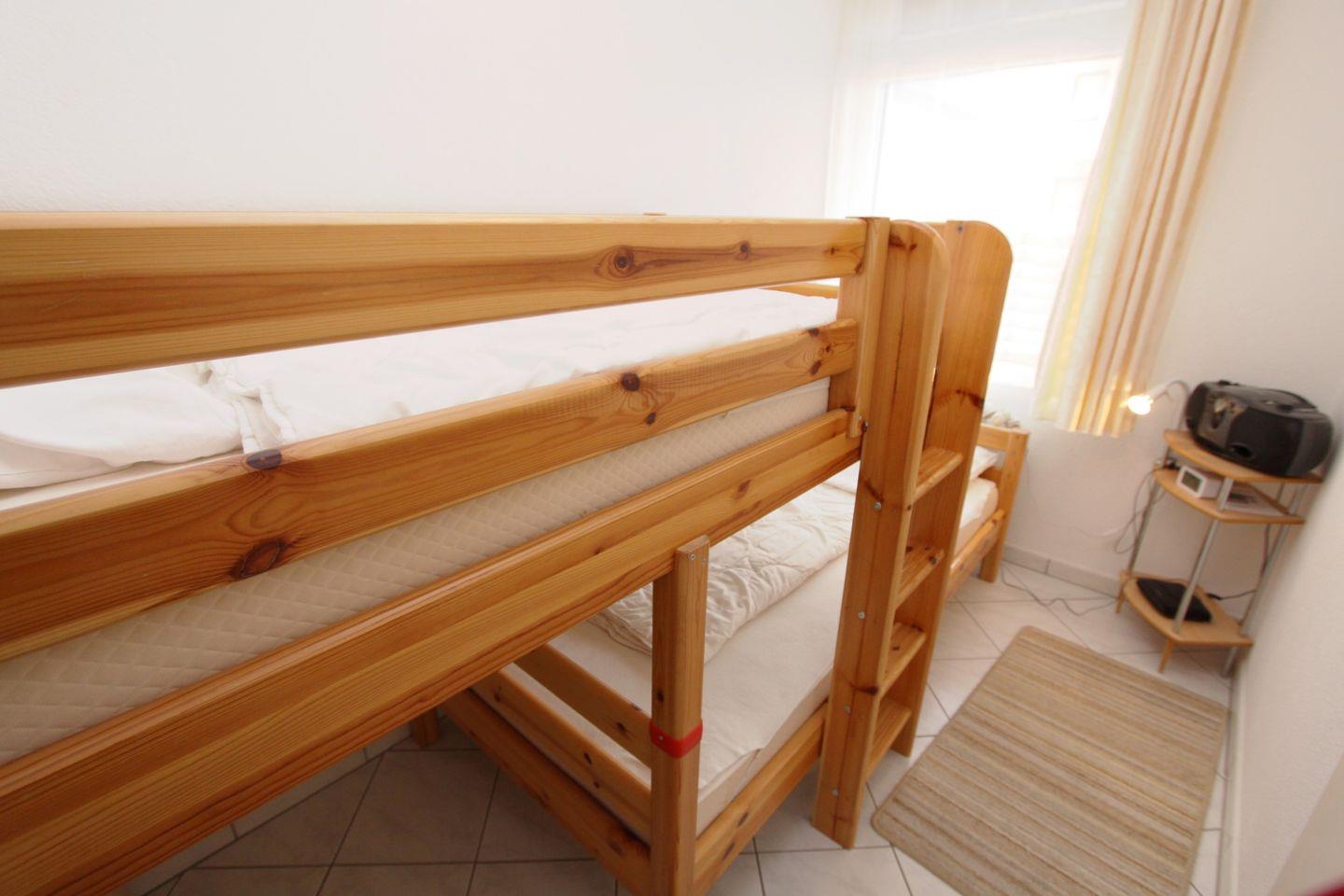 Die separate Einbauküche, mit durchreiche zum Essplatz, ist mit einem Geschirrspüler, einem Cerankochfeld, einer Mikrowelle Plus, einem Kühlschrank mit Gefrierfach, Toaster, Kaffeemaschine und einem Wasserkocher ausgestattet. Zurück auf den Flur gelangen Sie in die zwei separaten Schlafzimmer. Eines der Schlafzimmer verfügt über ein Etagenbett (90x200 cm), das zweite über ein Doppelbett (2x90x200 cm) mit Kommode und Flach TV. Auf dem kleinen Vorflur zum Duschbad bietet der Einbauschrank genügend Stauraum.