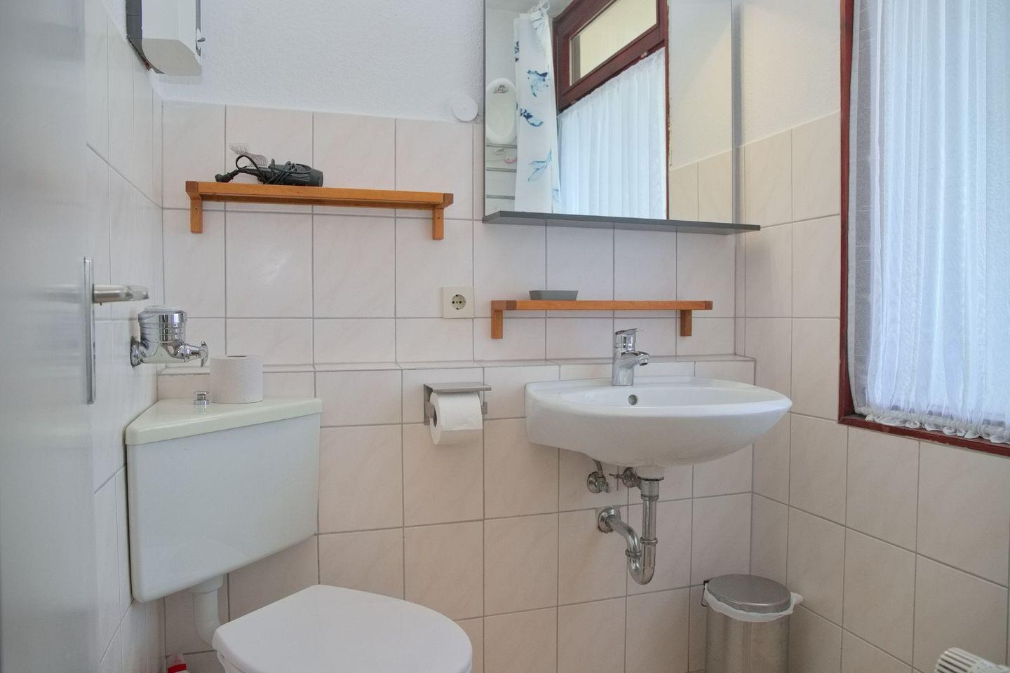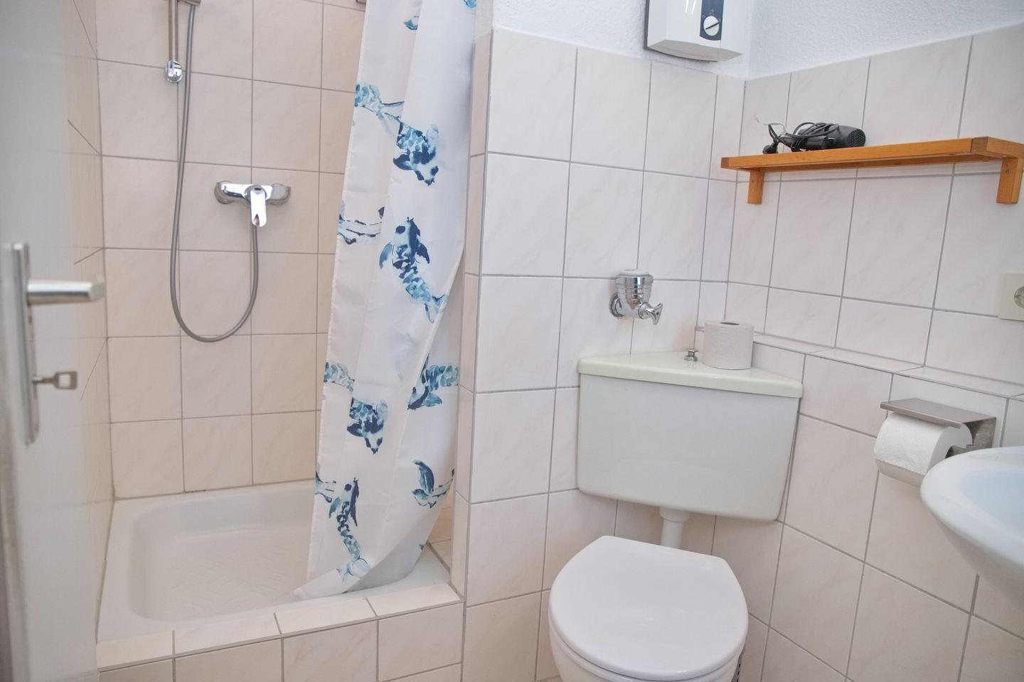 Das Badezimmer ist modern gestaltet und verfügt über eine Dusche und WC.