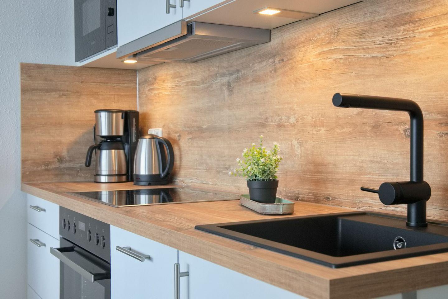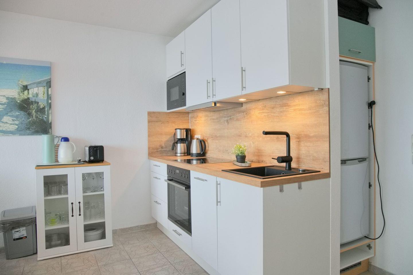 Die Küche ist voll ausgestattet mit einer Tiefkühlkombination, einem Ceranfeld, einem Backofen, einem Geschirrspüler, einer Mikrowelle, einer Kaffeemaschine, einem Wasserkocher und einem Toaster. Hier können Sie nach Lust und Laune köstliche Mahlzeiten zubereiten und den Blick auf das Meer genießen.