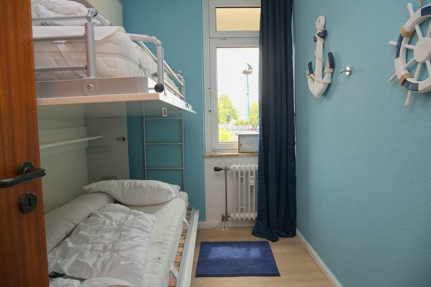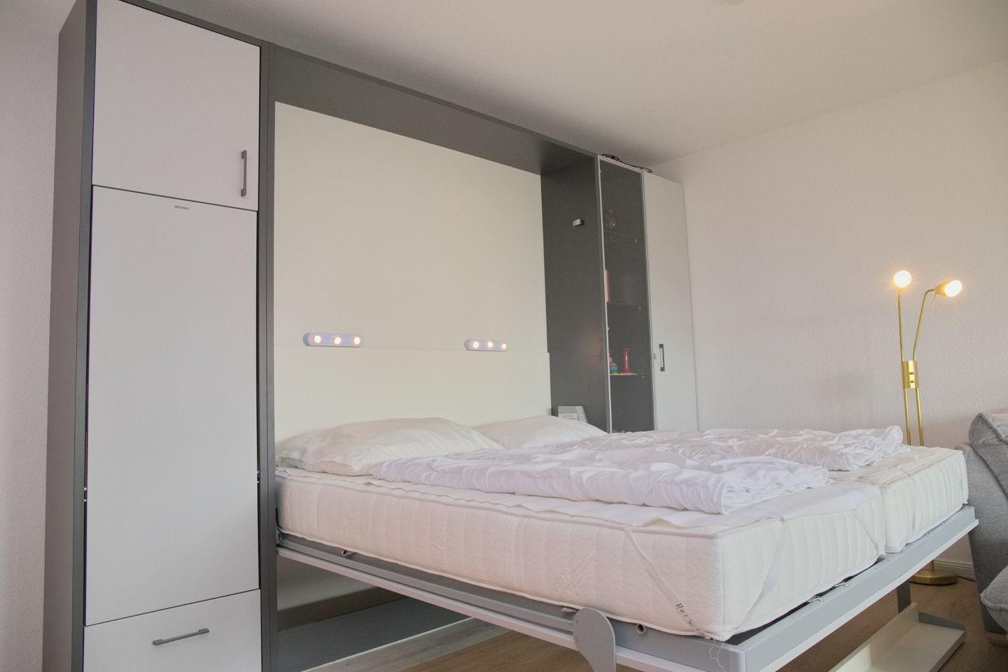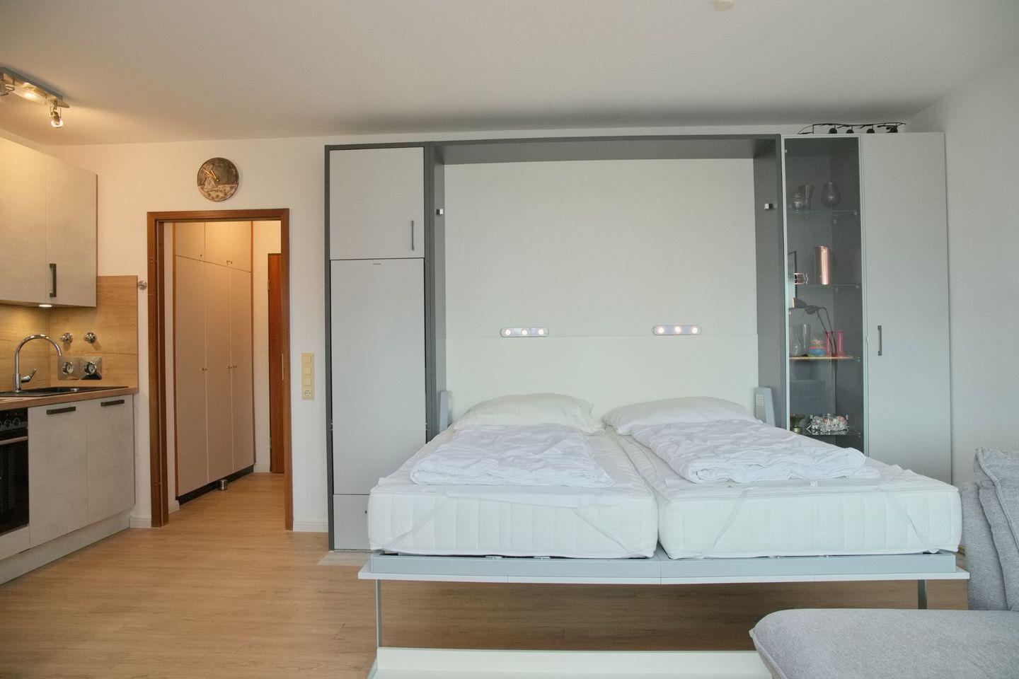 Die 2-Zimmer Ferienwohnung mit Südbalkon ist ideal für Paare oder kleine Familien, die einen erholsamen Urlaub in einem gemütlichen Zuhause verbringen möchten. Die Wohnung besteht aus einem Schlafzimmer mit einem Etagenbett in Form eines Schrankklappbettes, sowie einem Wohnzimmer mit einem Esstisch, einem Sofa, einem Smart-TV und einem Doppelbett in Forma eines Schrankklappbettes.