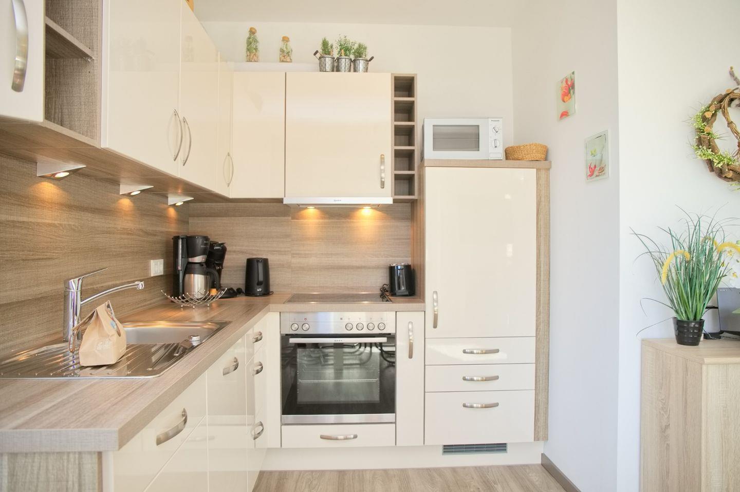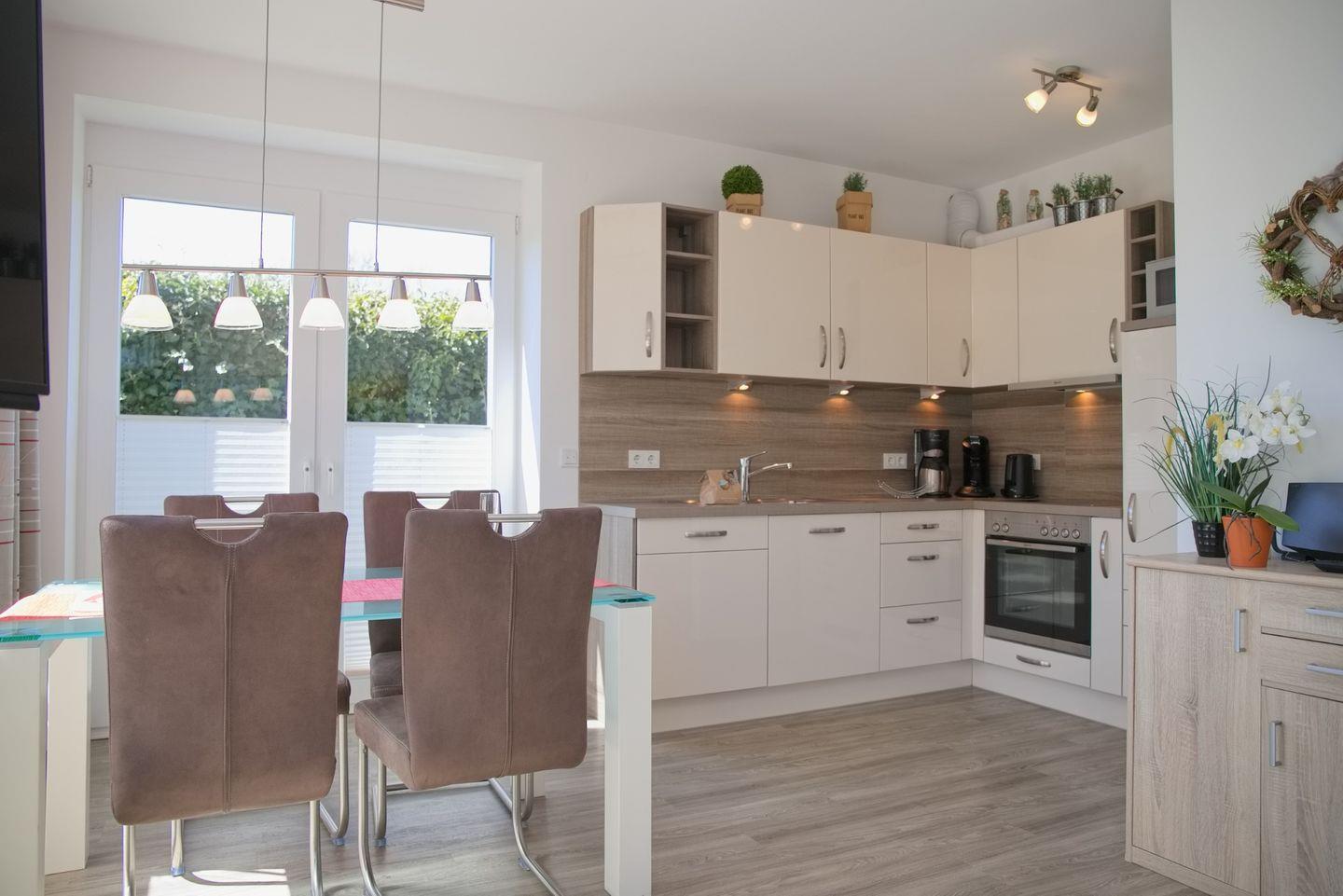 Die offene Wohnküche ist mit einem Cerankochfeld, einem Backofen, einer Spülmaschine sowie einer Mikrowelle und einem Kühlschrank ausgestattet. Für den täglichen Bedarf stehen Ihnen zudem ein Wasserkocher, ein Toaster und eine Kaffeemaschine zur Verfügung – hier gelingt Ihnen die Selbstversorgung mit Leichtigkeit. Der großzügige Essbereich und die Sofaecke im Wohnzimmer laden dazu ein, gesellige Abende zu verbringen und die gemeinsame Zeit zu genießen.