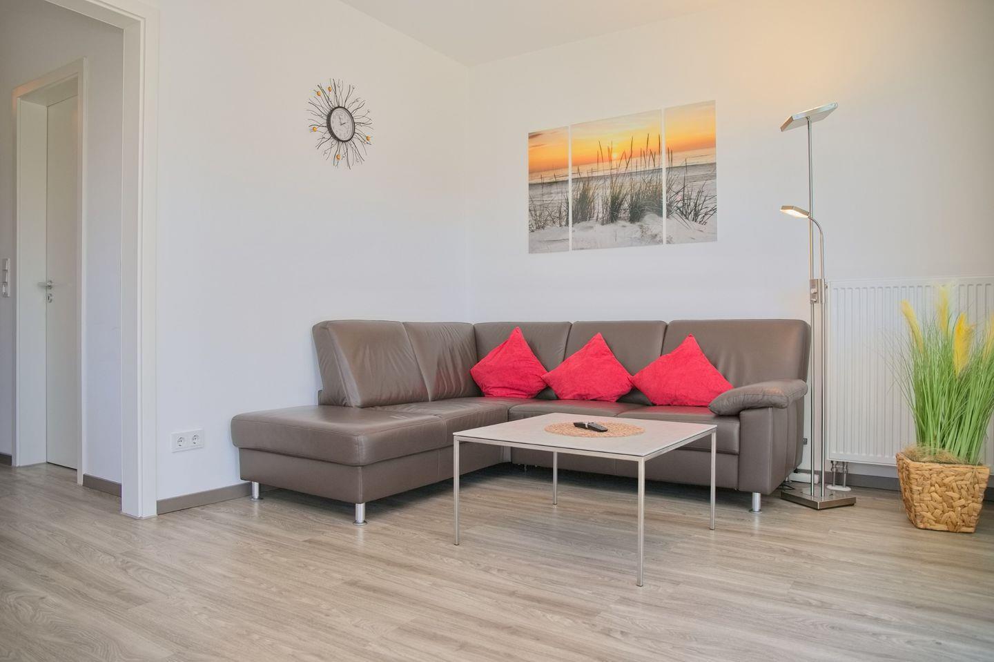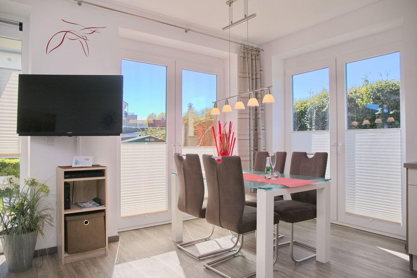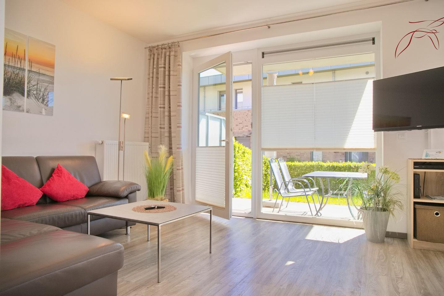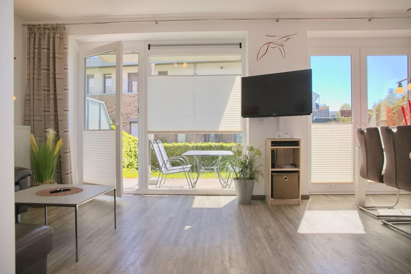 Sehr moderne und hochwertige Ferienwohnung mit möblierter Terrasse und kleinen Garten in einer stilvoll angelegten Wohnanlage.