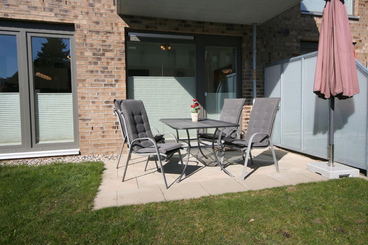 Die Wohnung bietet Ihnen einen direkten Zugang zu einer überdachten Terrasse, die mit Gartenmöbeln ausgestattet ist. Hier können Sie morgen früh bei einem Kaffee entspannen oder am Abend den Tag ausklingen lassen. Der Garten bietet zusätzlich einen Sichtschutz, der Ihnen eine private Atmosphäre garantiert. Als Nichtraucherunterkunft ist das Objekt allergikergeeignet und stellt sicher, dass Ihr Aufenthalt angenehm und ungestört verläuft.