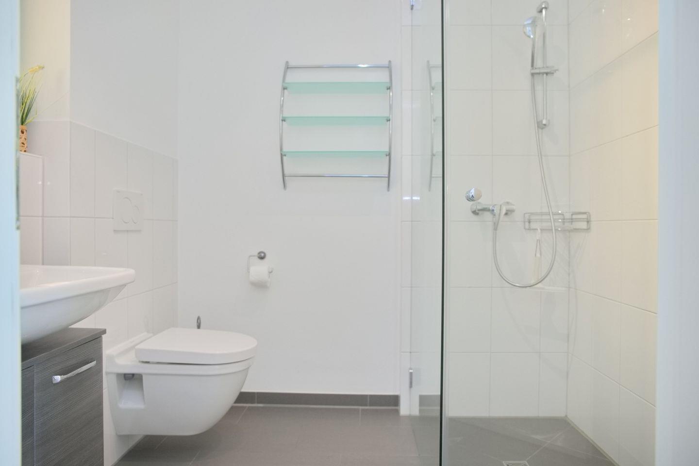 Das Badezimmer ist mit einer bodengleichen Dusche, einem Waschbecken und WC versehen. Für zusätzlichen Komfort sorgt die Fußbodenheizung, die auch an kühleren Tagen für wohlige Wärme sorgt. Darüber hinaus genießen Sie in der gesamten Unterkunft WLAN, damit Sie jederzeit mit Ihren Liebsten in Kontakt bleiben oder Ihre Urlaubsfotos sofort teilen können. Auch bei schlechtem Wetter können Sie entspannen, dank des CD- und DVD-Players sowie einem Fernseher, der in zwei Zimmern vorhanden ist.
