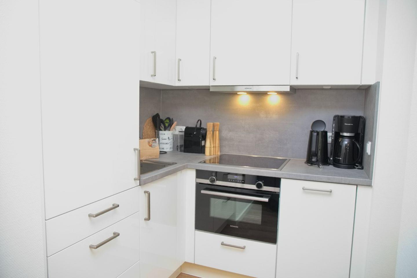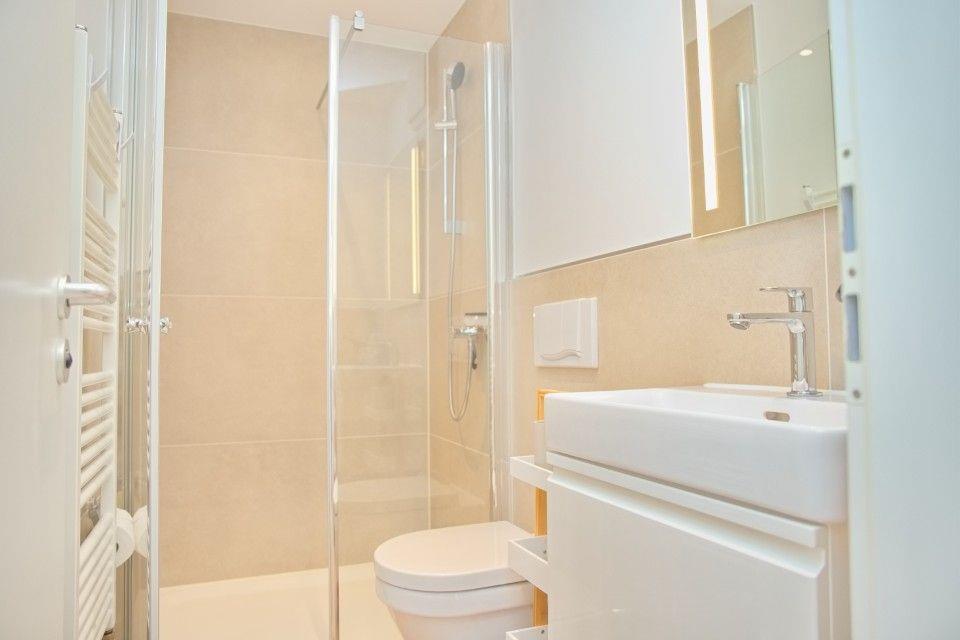 Das Wohnzimmer besticht durch eine moderne Couchgarnitur und den direkten Zugang zur Terrasse. Der Essbereich ist perfekt für zwei Personen und sorgt für gemütliche Dinner-Atmosphäre. Die offene Einbauküche ist voll ausgestattet und lässt keine Wünsche offen: Ceranfeld, Backofen, Geschirrspüler, Kühlschrank mit Gefrierfach, Mikrowelle, Nespressomaschine, Filter-Kaffeemaschine, Toaster und Wasserkocher stehen Ihnen zur Verfügung, damit Sie sich kulinarisch austoben können.
