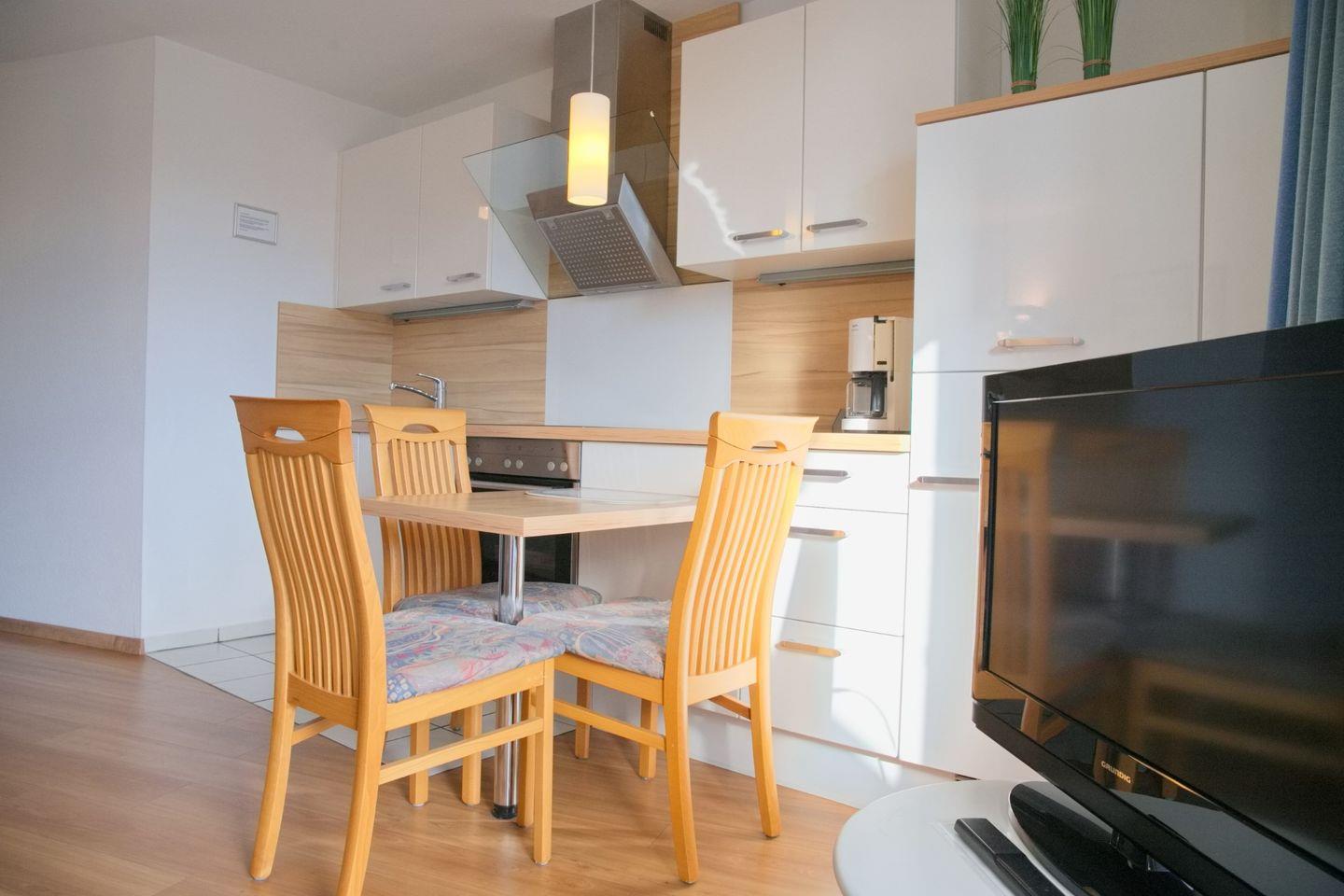 und einen Essbereich mit 3 Stühlen. Die zum Wohnzimmer offene und stilvolle