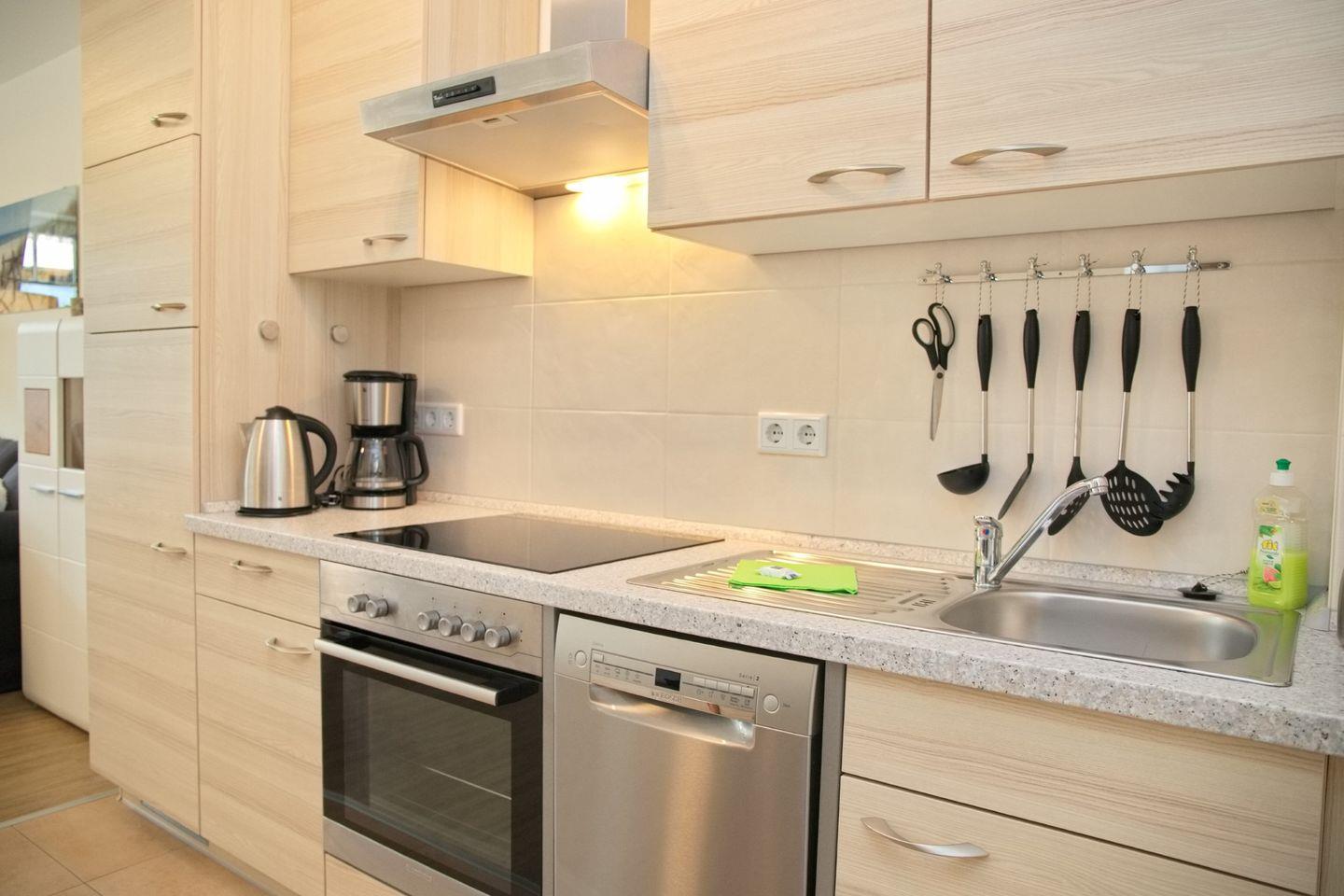 In der offenen Küche finden Sie alles, was das kulinarische Herz begehrt: Ceranherd, Spülmaschine, Backofen, Kühlschrank mit 3* Gefrierfach, Kaffeemaschine, Wasserkocher und Toaster stehen bereit. Der Essbereich bietet Platz für 4 Personen und lädt zu gemütlichen Mahlzeiten ein.