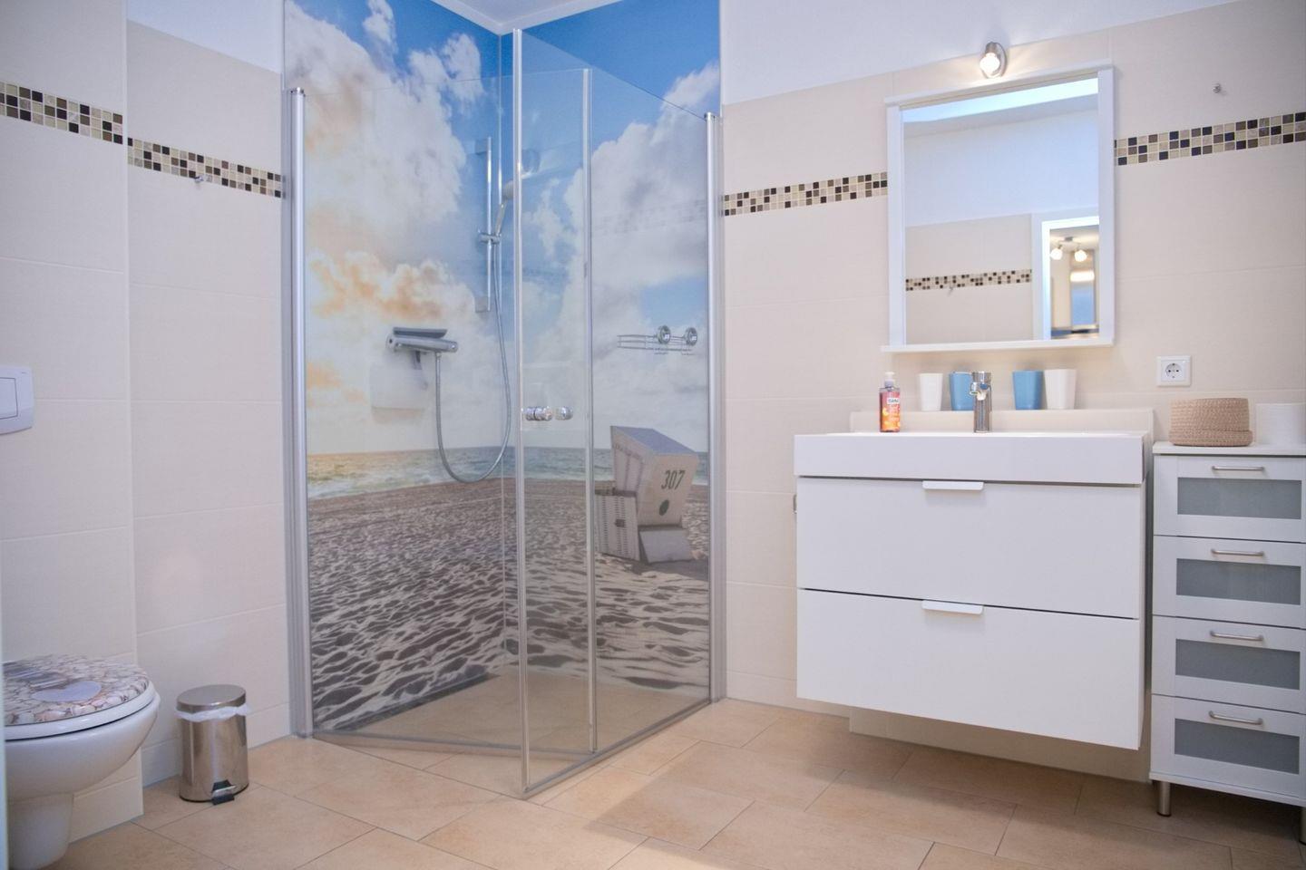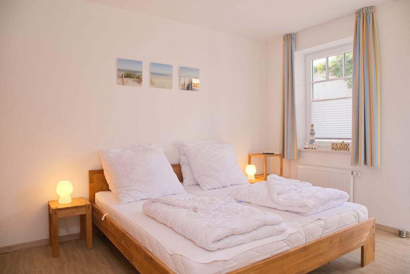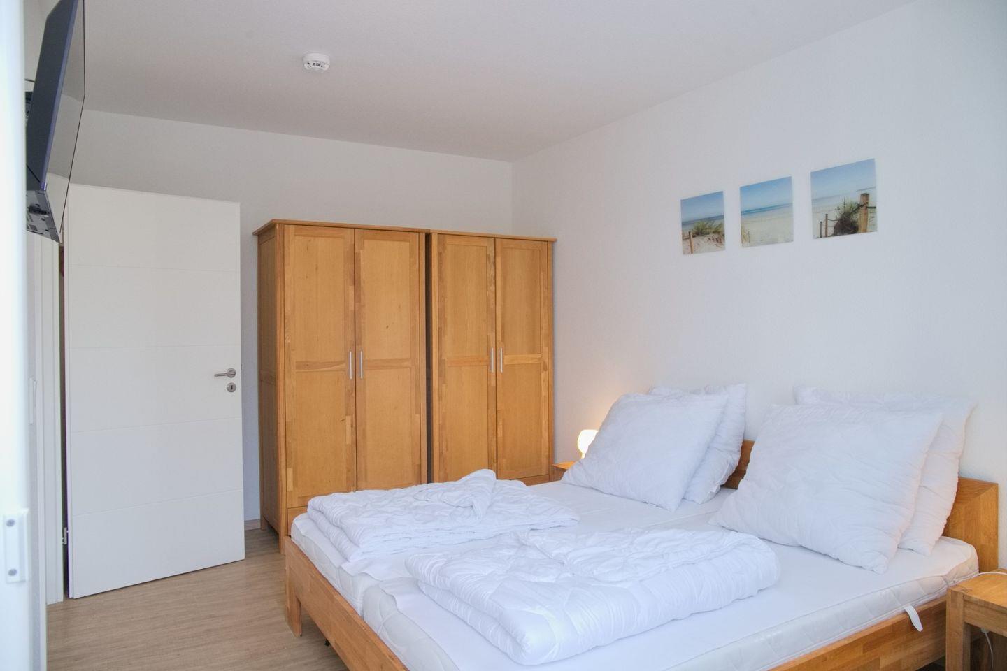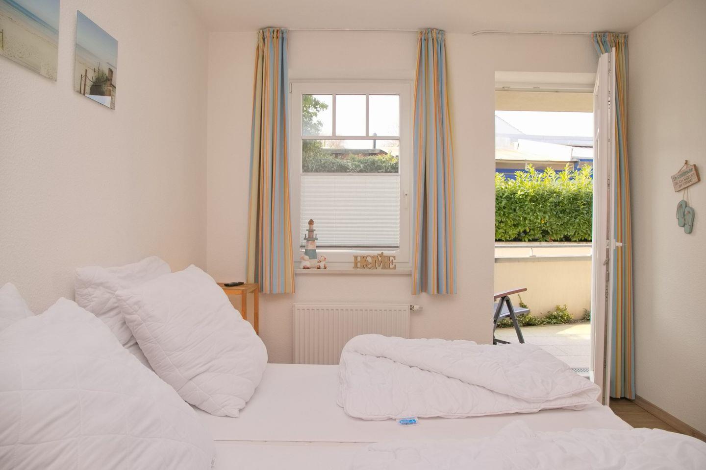 Das Schlafzimmer überzeugt mit einem komfortablen Doppelbett (2x90x200 cm), einem geräumigen Kleiderschrank und erneutem Zugang zur Terrasse. Das moderne Badezimmer punktet mit einer ebenerdigen Dusche, Waschtisch, WC und Handtuchheizung.