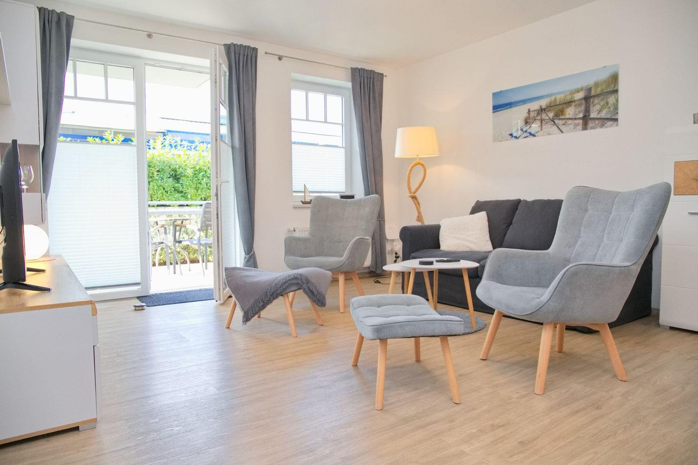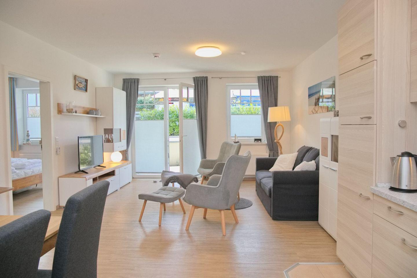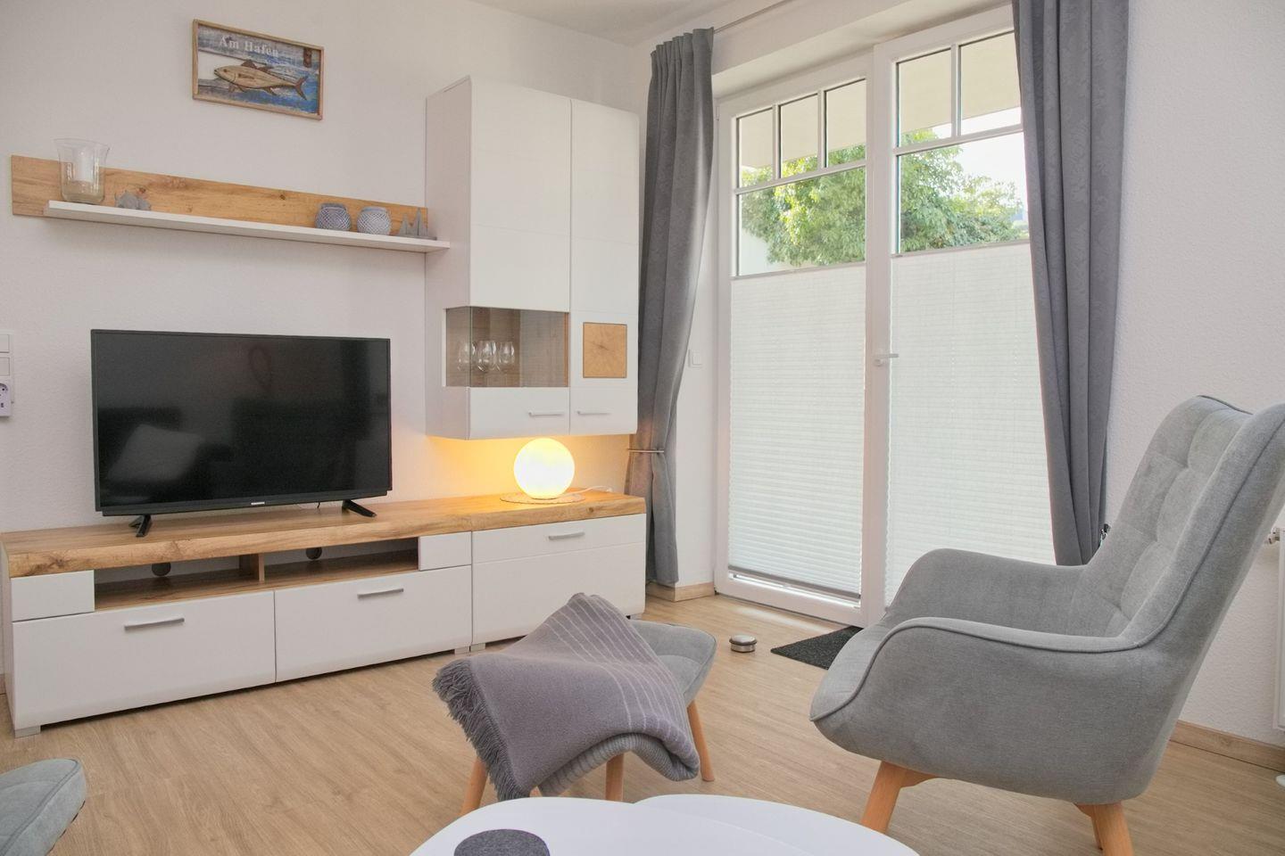 Das großzügige Wohnzimmer lädt zum Verweilen ein, mit einer komfortablen Schlafcouch (Liegefläche 140 x 200 cm), Radio, TV und direktem Zugang zur möblierten Terrasse in Westlage. Genießen Sie hier entspannte Stunden.