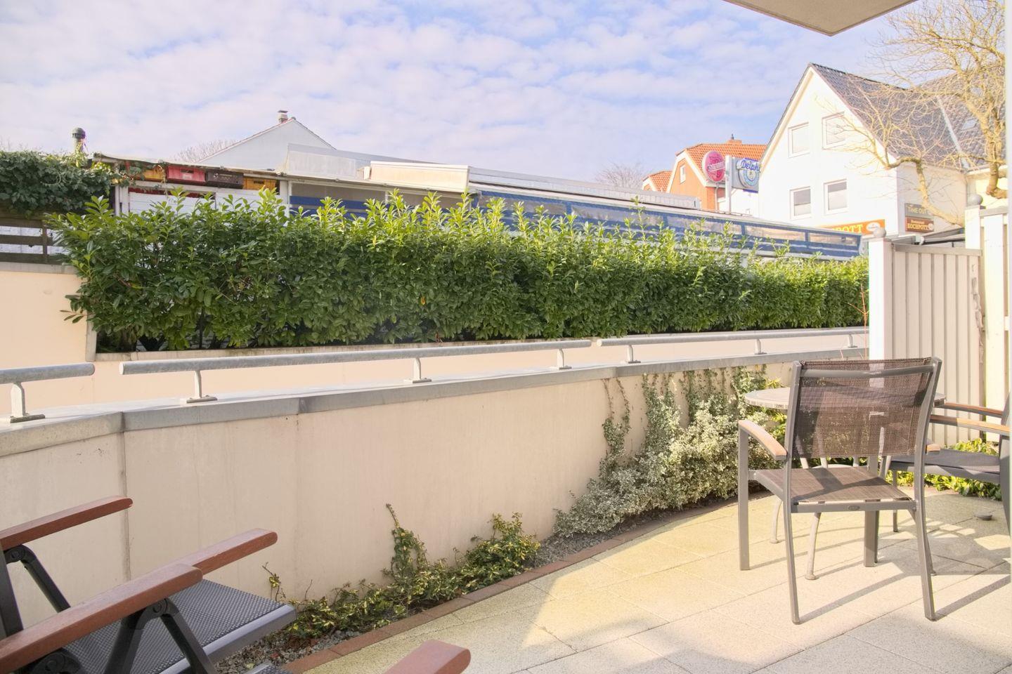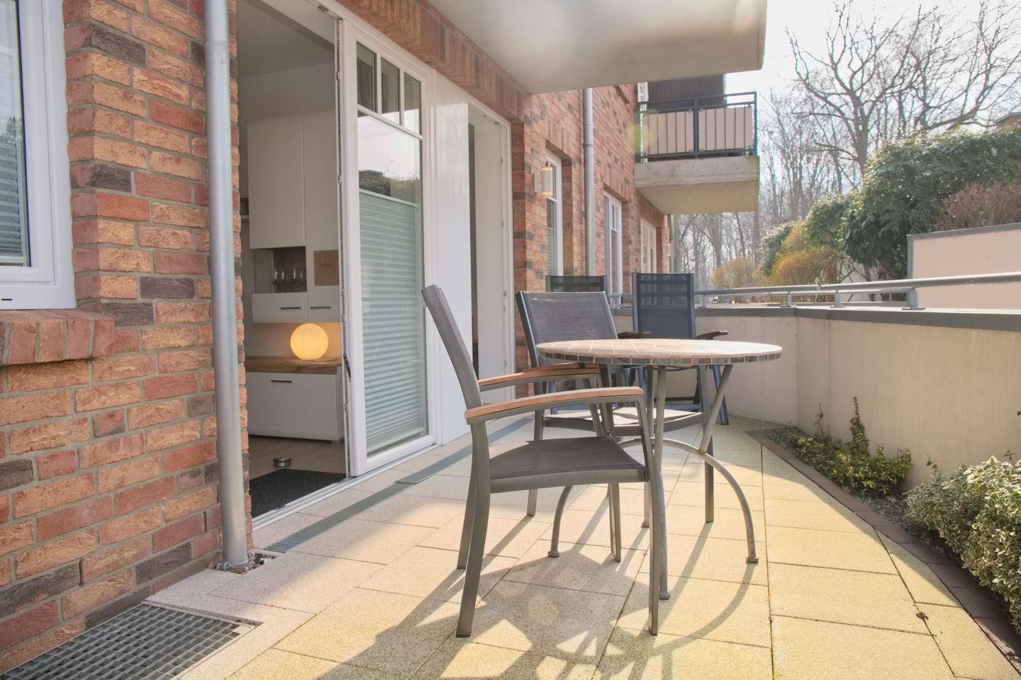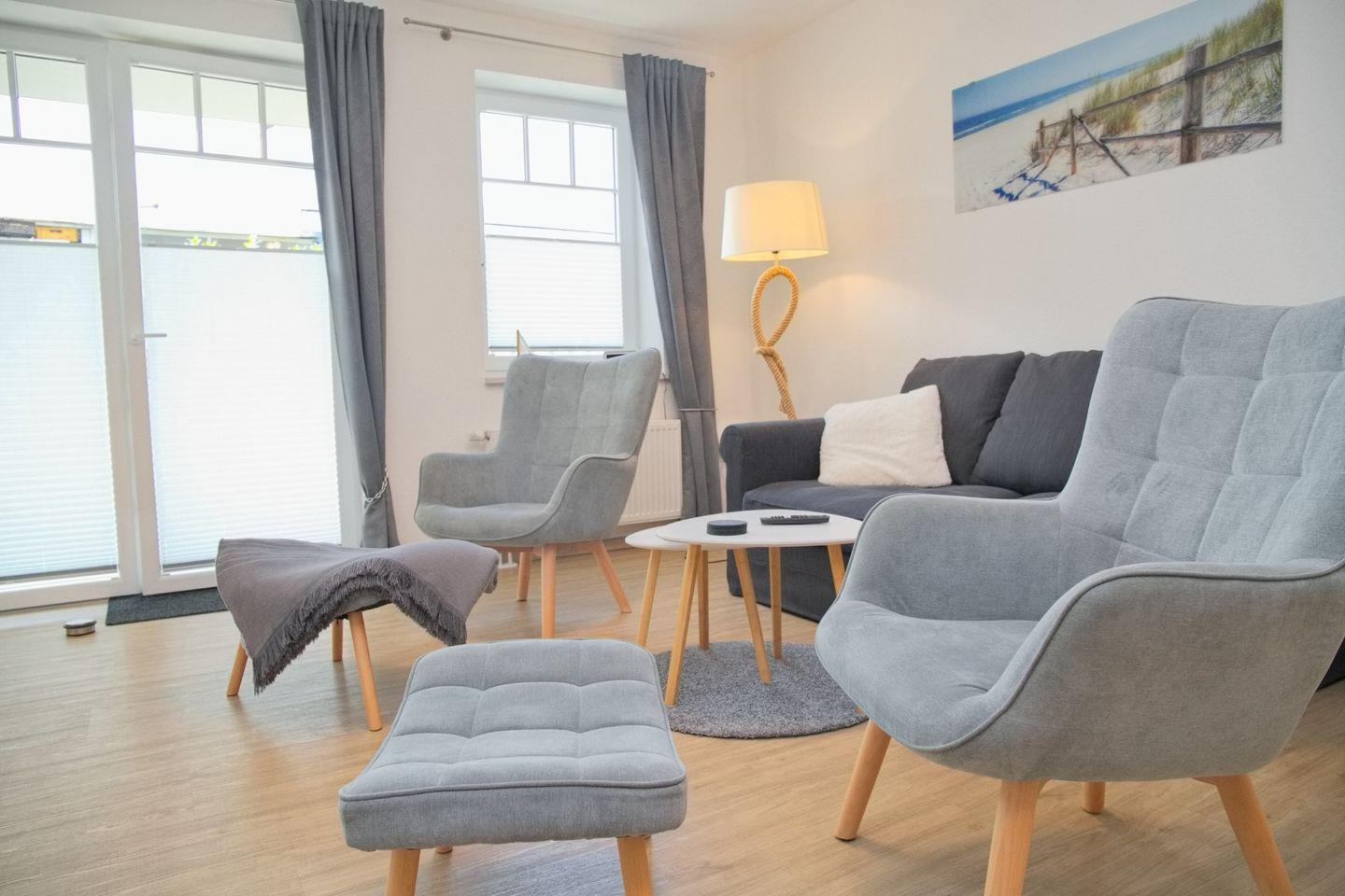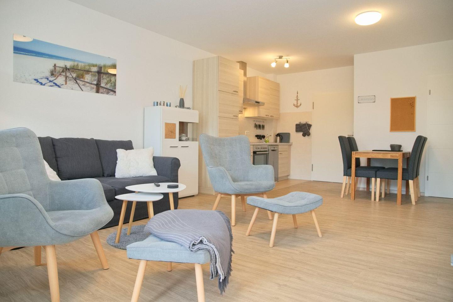 Das großzügige Wohnzimmer lädt zum Verweilen ein, mit einer komfortablen Schlafcouch (Liegefläche 140 x 200 cm), Radio, TV und direktem Zugang zur möblierten Terrasse in Westlage. Genießen Sie hier entspannte Stunden.