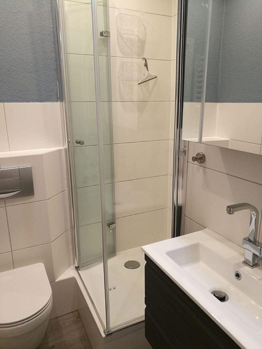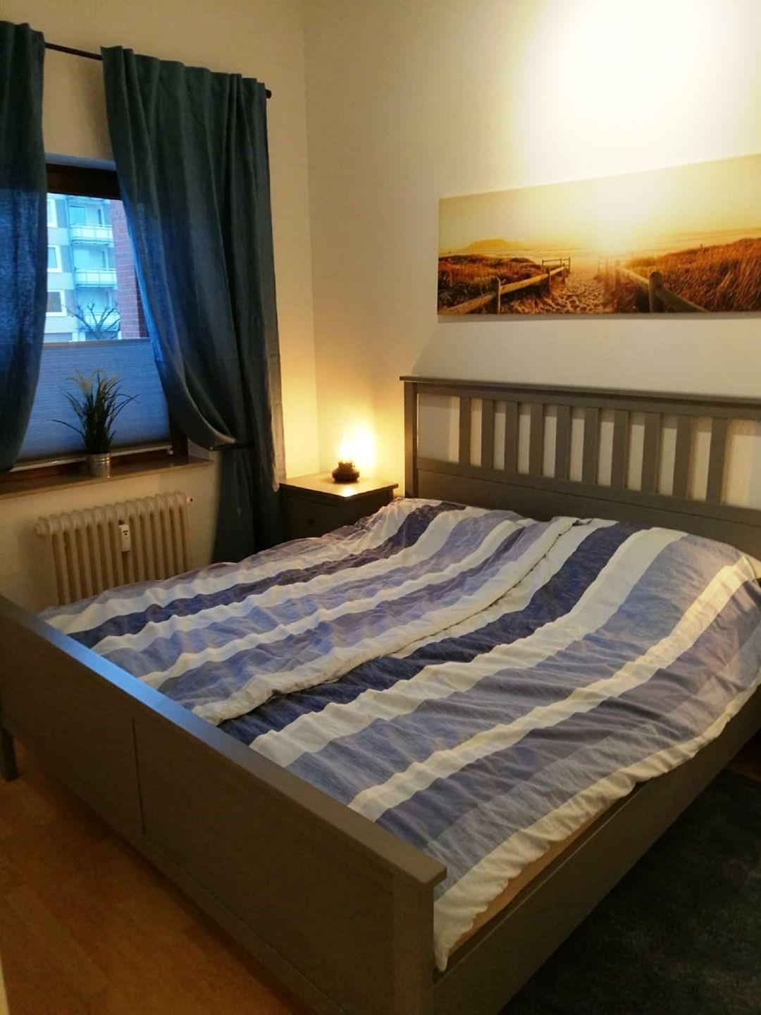 Im Schlafzimmer befinden sich ein Doppelbett (180 x 200 cm), ein Kleiderschrank, eine Kommode und zwei Nachttische. Die dunklen Übergardinen schaffen zusätzlich Privatsphäre und Gemütlichkeit. Die Wohnung verfügt über ein neues Bad mit WC, Regendusche, Handtuchheizkörper, Spiegelschrank und Haartrockner.