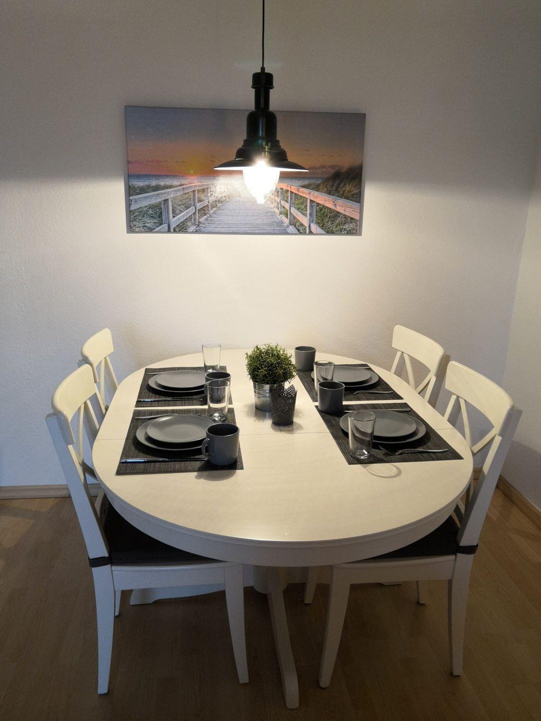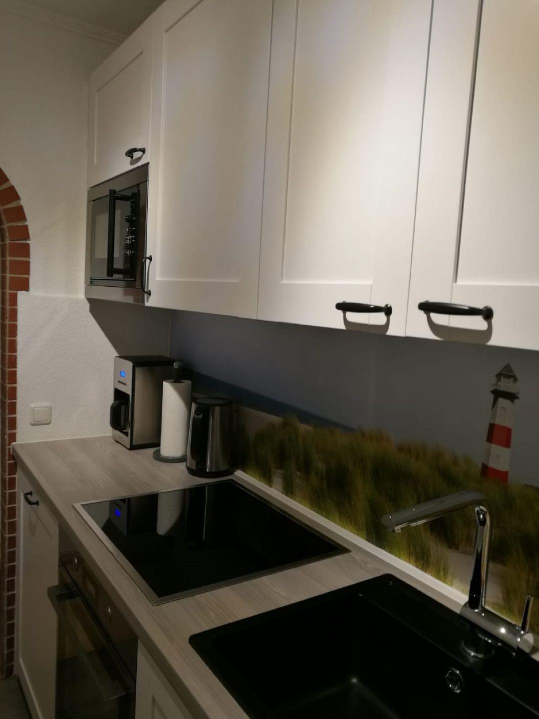 Die in 2019 komplett sanierte, geschmackvoll eingerichtete 2-Zimmer-Wohnung im skandinavischen Stil liegt in der ersten Etage mit Südbalkon mit ansprechender Möblierung mit eingeschränktem Meerblick. Vom Balkon aus können Sie das Meer rauschen hören. Im hellen und modernen Wohnzimmer gibt es eine große Schlafcouch (140 x 200 cm) für 2 Personen, einen Sessel, eine Kommode, einen 55-Zoll-Flatscreen, ein Radio mit USB- und MP3-CD-Player und eine Essecke mit 4 Stühlen. Der lichtdurchflutete Raum lädt zum relaxen und entspannen ein. Hier können Sie den Urlaubstag mit einem leckeren Frühstück beginnen. Planen Sie in dieser gemütlichen Atmosphäre die Aktivitäten für den nächsten Tag und lassen Sie den Urlaubstag entspannt ausklingen. Die separate Küche ist ausgestattet mit einem Induktionskochfeld und einer Dunstabzugshaube, einem Backofen, einem großen Kühlschrank mit Gefrierfach, einem Geschirrspüler, einer Mikrowelle, einer Kaffeemaschine, einem Wasserkocher und einem Toaster.