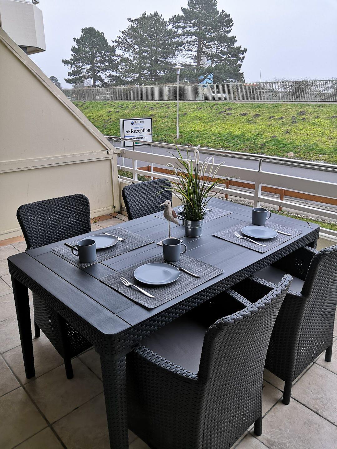 Moderne 2 Zimmerwohnung nur 80 Meter vom Meer entfernt mit großem möblierten Südbalkon. Inklusive kostenlosem WLAN und PKW- Stellplatz.