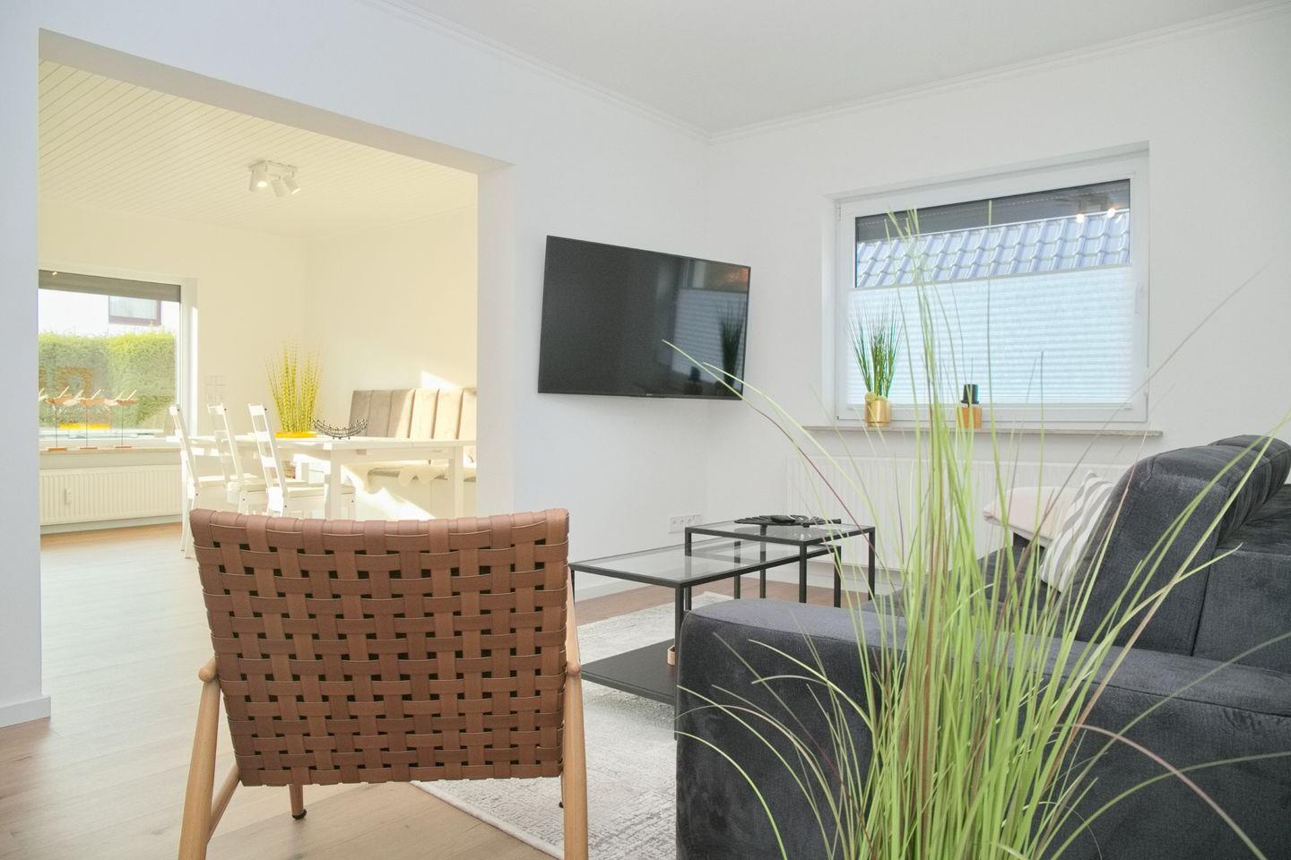 Das geräumige Wohnzimmer ist gemütlich eingerichtet mit einer Dreisitzercouch und einem modernen Sessel. Für Unterhaltung sorgt ein Flachbild-TV. Die offene Gestaltung des Raumes lässt viel Licht herein und schafft eine angenehme, einladende Atmosphäre.