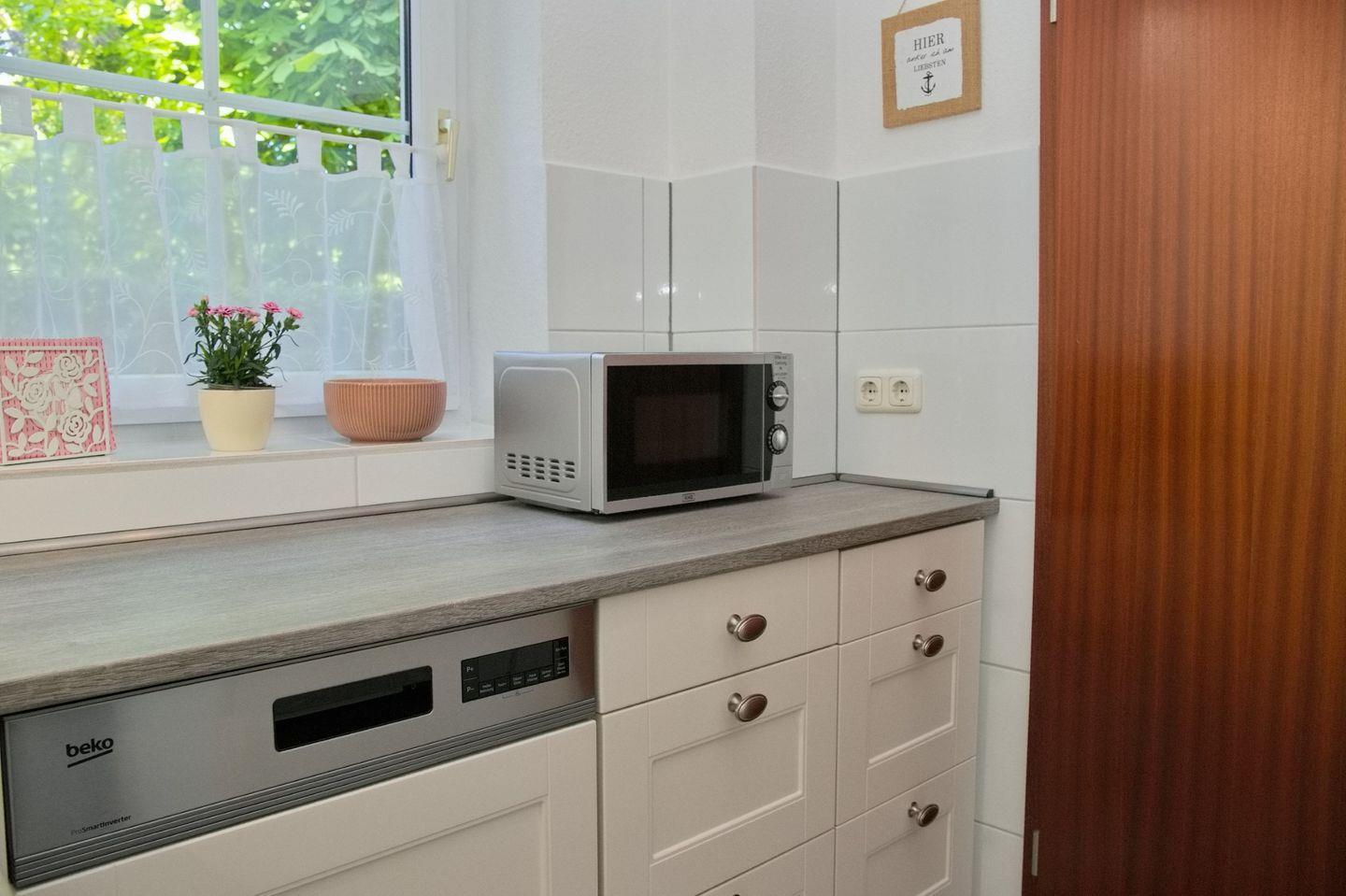 Die separate Küche mit Fenster lässt keine Wünsche offen und ist vollständig ausgestattet mit einem Herd inklusive Cerankochfeld und Backofen, einer Dunstabzugshaube, einem großen Kühlschrank mit Gefrierfach, sowie einer Mikrowelle, einem Geschirrspüler und verschiedenen kleinen Elektrogeräten wie Wasserkocher, Kaffeemaschine, Mixer und Toaster. Hier können Sie Ihrer Kochkunst freien Lauf lassen und sich kulinarisch verwöhnen.