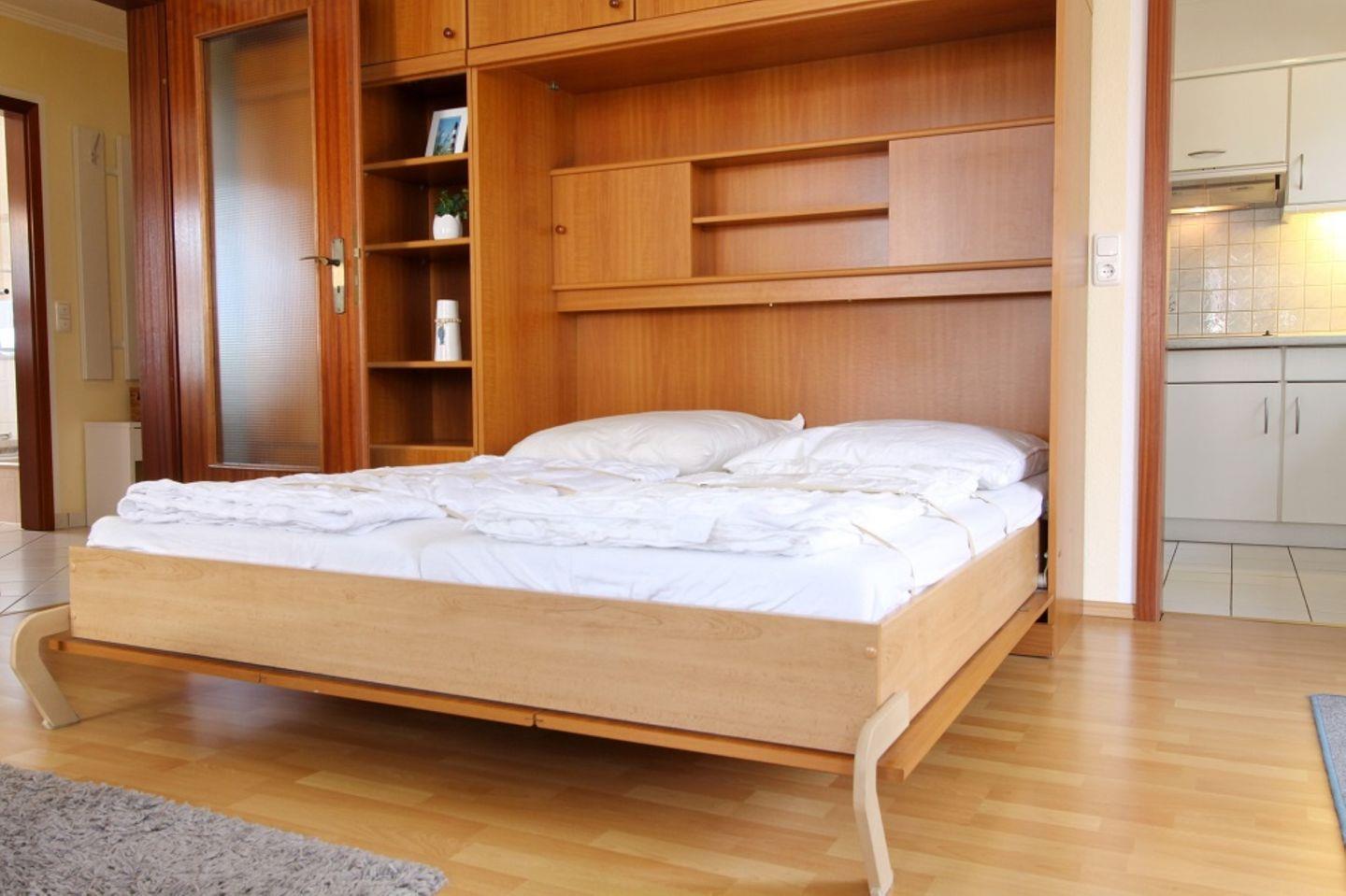 Das Wohnzimmer ist gemütlich eingerichtet und verfügt über eine komfortable Couch sowie ein platzsparendes Doppelschrankbett, das tagsüber unauffällig verstaut werden kann. Ein heller Erker bildet den perfekten Essbereich, der zum Genießen von Mahlzeiten oder einfach zum Entspannen einlädt. Dank der Außenjalousien können Sie die Helligkeit ganz nach Ihren Wünschen regulieren und für angenehme Lichtverhältnisse sorgen.