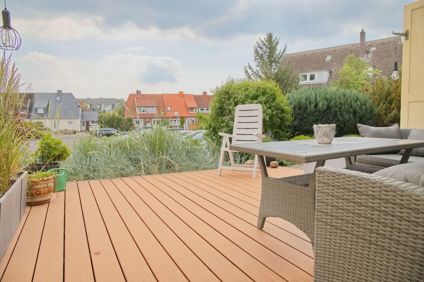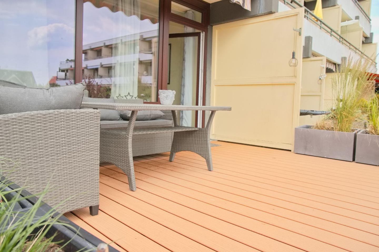 Die möblierte Terrasse mit Markise in Süd-/ Westlage lädt zu entspannten Sommerabenden ein.