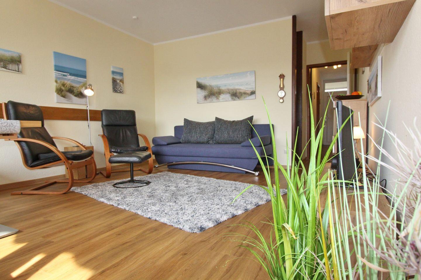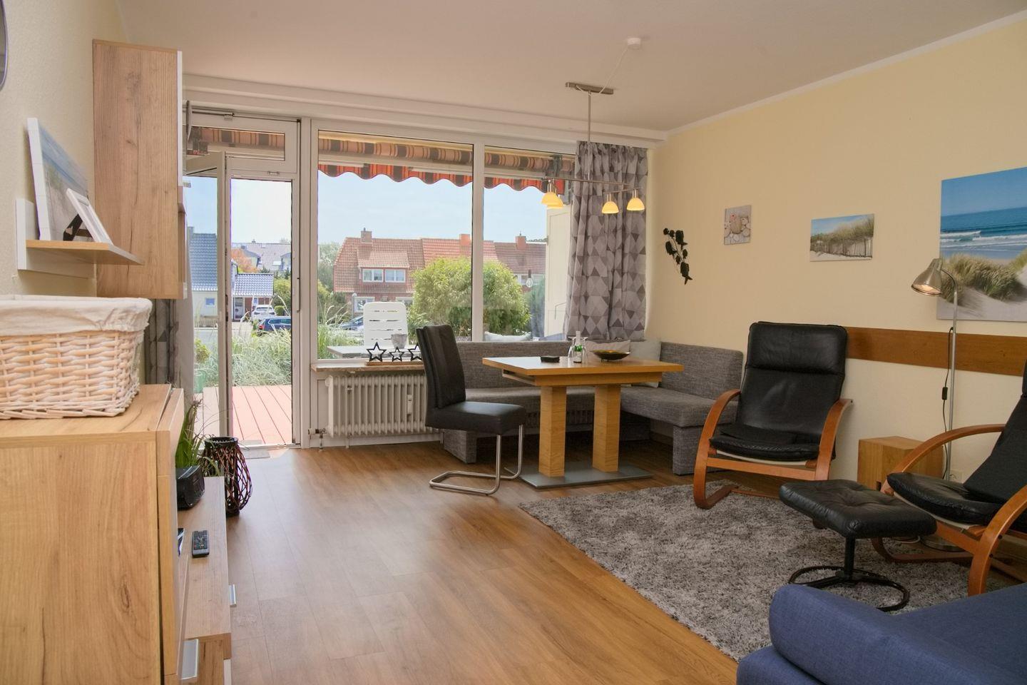 Diese ca. 50m² große 2 Zimmer Ferienwohnung befindet sich im Erdgeschoss mit möblierter Süd-/ West Terrasse und Markise.