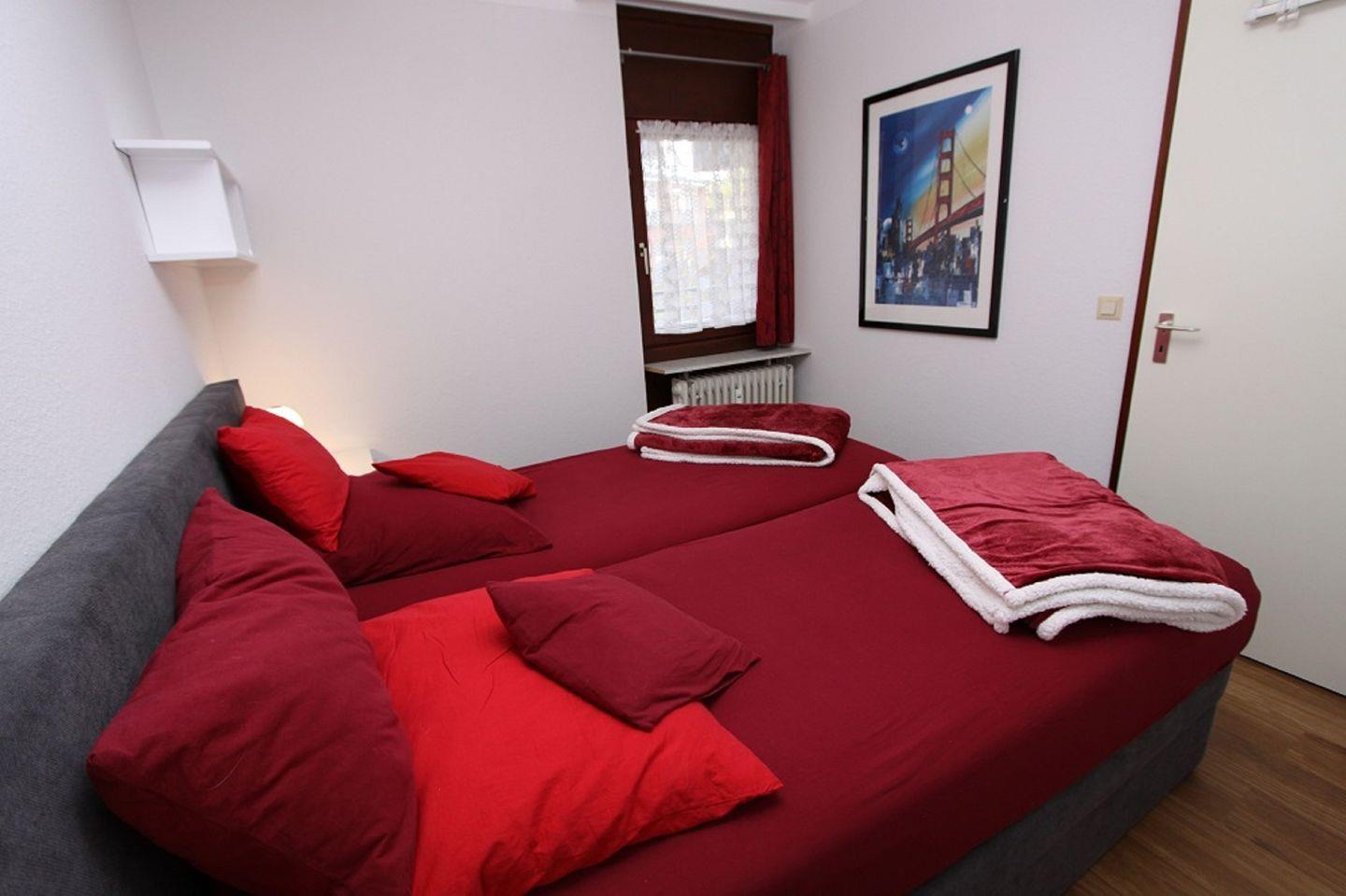 Das Schlafzimmer bietet Ihnen ein Doppelboxspringbett (2x80x200cm) und Ablageflächen.