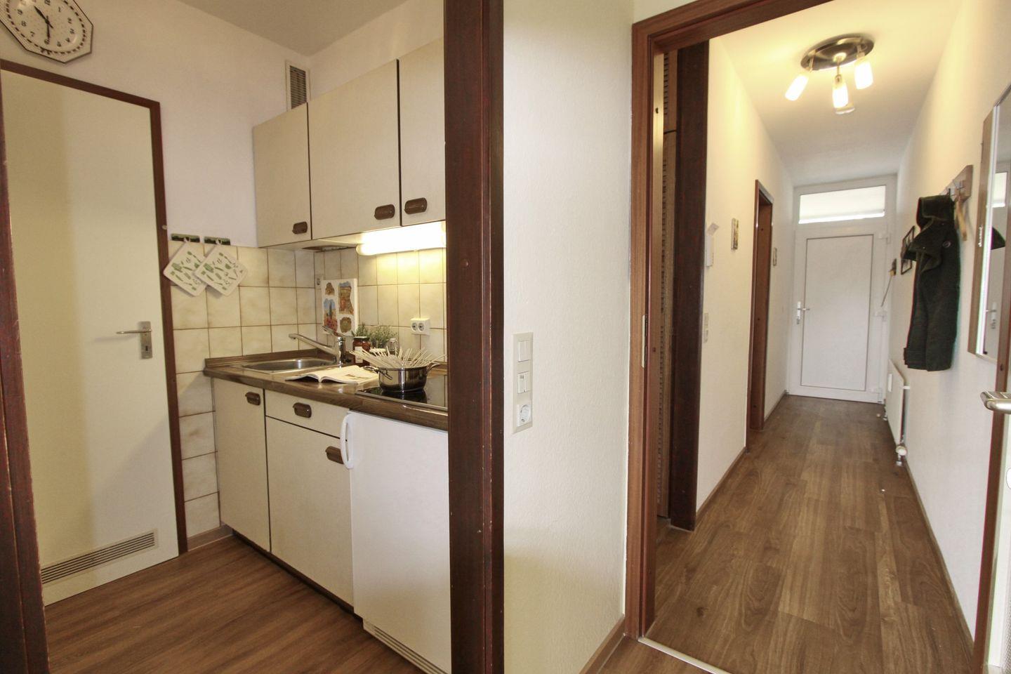 Zurück auf den Flur kommen Sie in die separate Küche. Hier finden Sie neben einem 4 Platten Cerankochfeld, einen Kühlschrank mit Gefrierfach, eine Kaffeemaschine, eine Senseo Padmaschine, einen Wasserkocher, einen Toaster und eine Mikrowelle.
