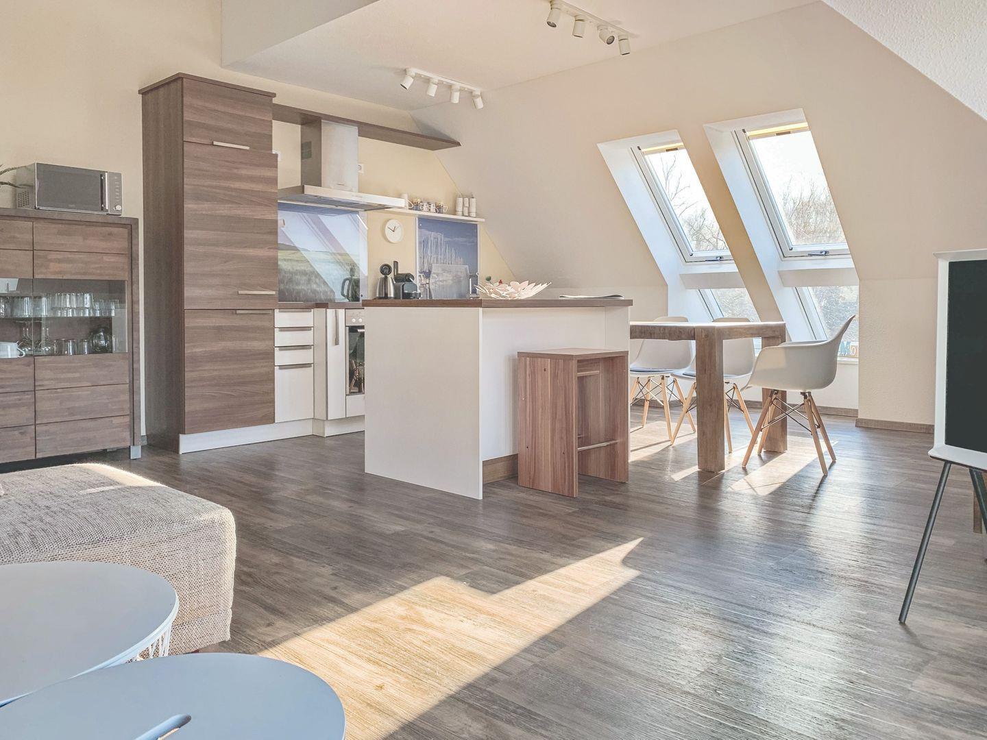Die voll ausgestattete, offene Einbauküche verfügt über ein Cerankochfeld, Backofen, Geschirrspüler, Mikrowelle, Kühlschrank mit Gefrierfach, Wasserkocher, Toaster und Kaffeemaschine. Der Essbereich findet unter den Dachflächenfenstern seinen Platz und ist dadurch hell und freundlich. Das erste Schlafzimmer bietet Ihnen ein Doppelbett mit Kleiderschrank und Stummendiener, das zweite Schlafzimmer ein Einzelbett und ein Schrankklappbett. Im zweiten Schlafzimmer stehen Ihnen außerdem ein weiterer Flachbild TV und ein DVD- Player zur Unterhaltung bereit.