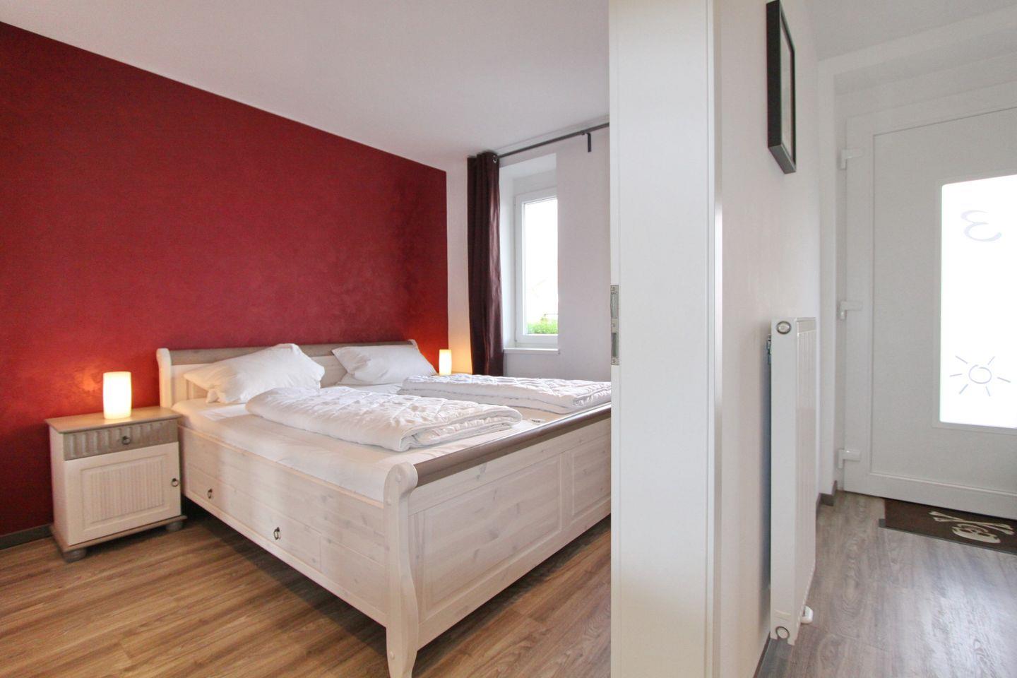 Im schicken Schlafzimmer ist ein bequemes Doppelbett, Nachttische mit Lampen und ein Kleiderschrank. Ein Reisebett für ein Baby passt zwischen Kleiderschrank und Bett.
