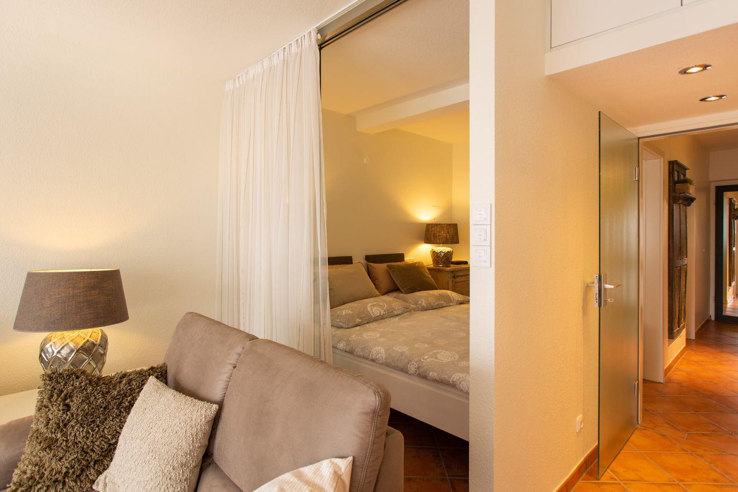 Hier steht Ihnen neben einem Essbereich mit Korbstühlen und Kinderhochstuhl, ein zwei Sitzer und ein drei Sitzer für wohlige Abende zur Verfügung. Ein Flach TV, ein CD Player und eine Stereoanlage stehen zur Unterhaltung bereit. Im Wohnbereich ist ein weiterer Raum mit Glaselementen und Vorhängen abgetrennt. Hier steht Ihnen ein Doppelbett (2x90x200cm) und ein weiterer Flach TV zur Verfügung. Ein separates Schrankzimmer bietet ausreichend Verstaumöglichkeiten. Der Balkon in Süd-/ Westausrichtung ist mit einer Loungegarnitur, Tisch und zwei Stühlen bestückt.