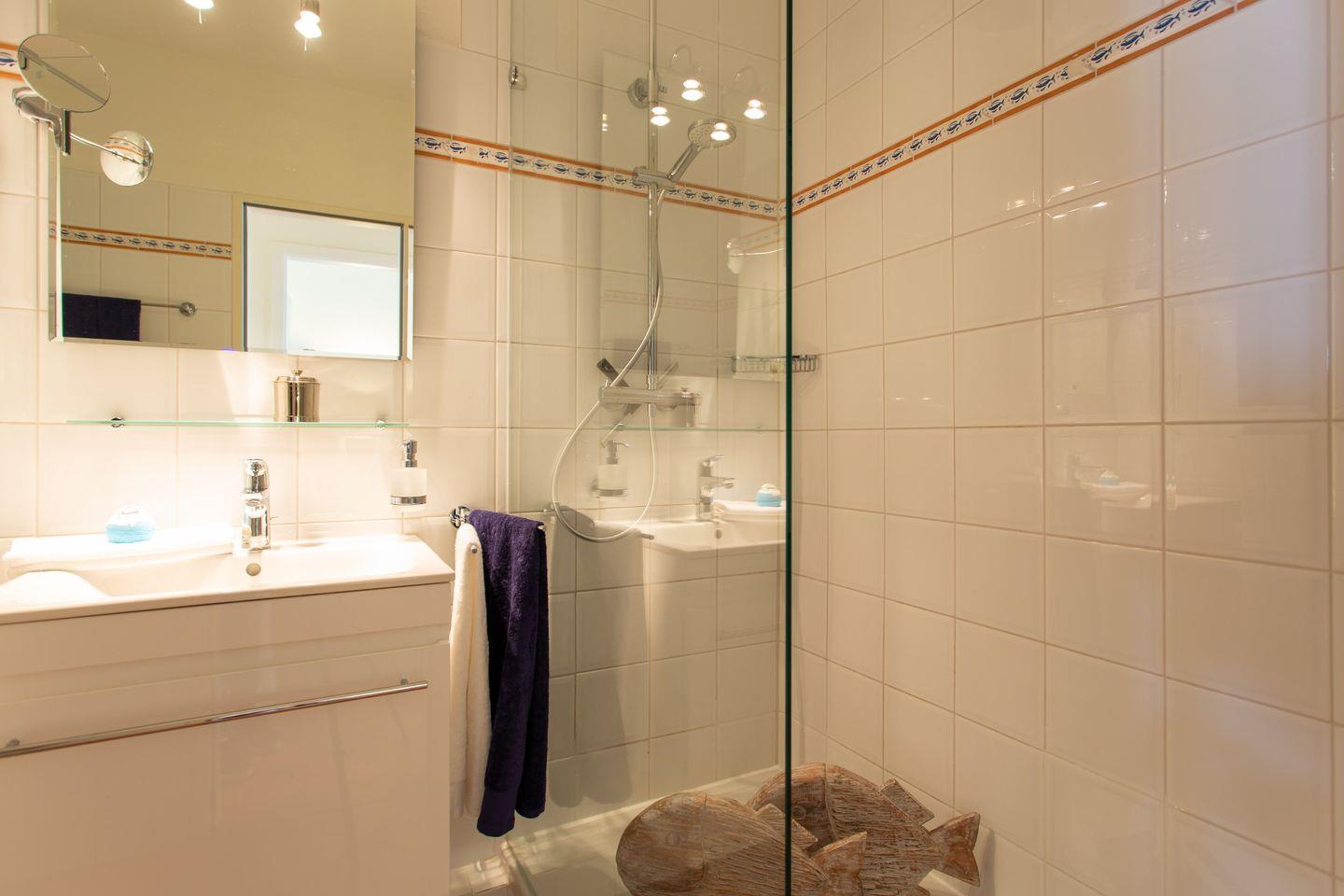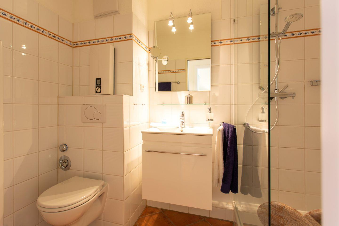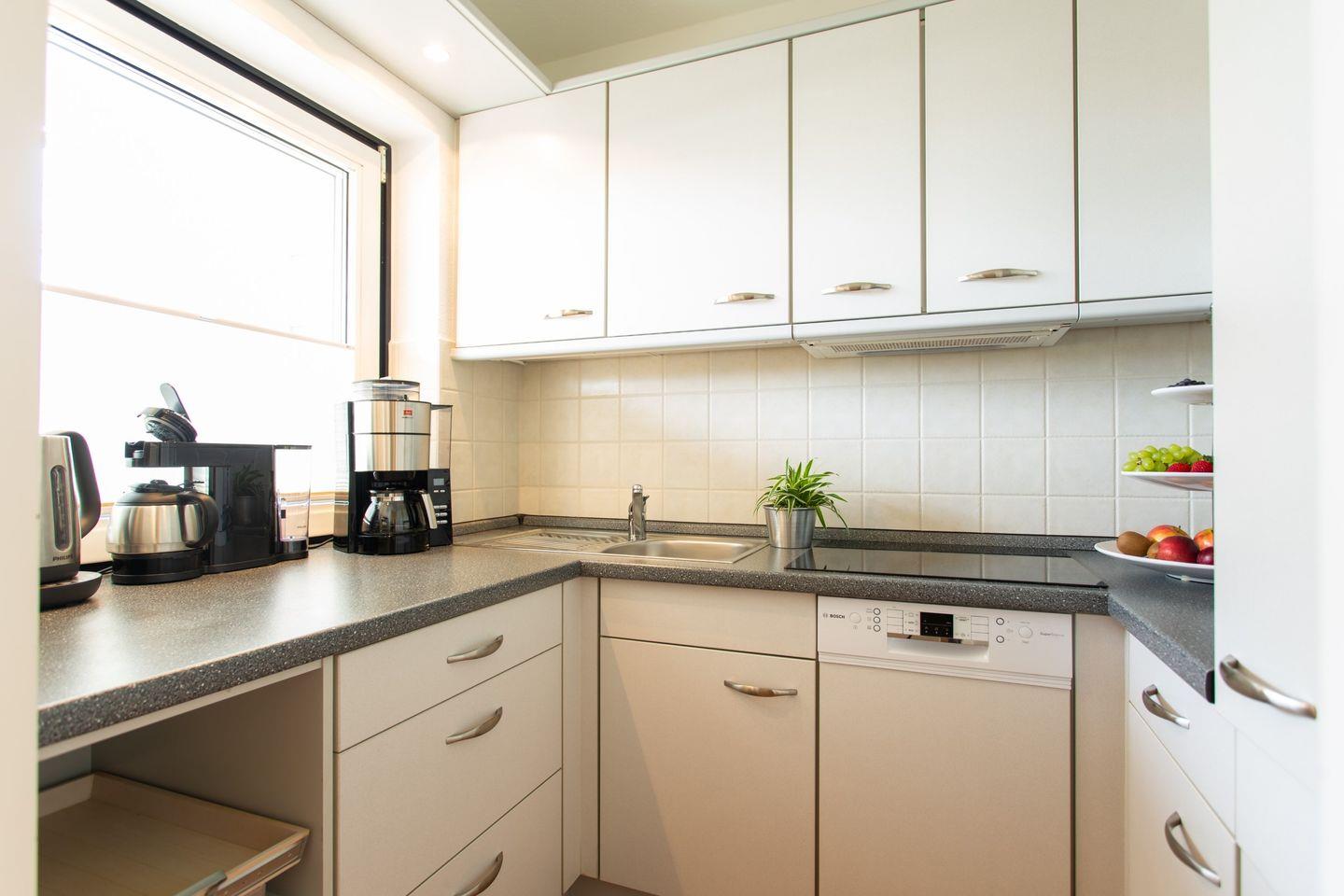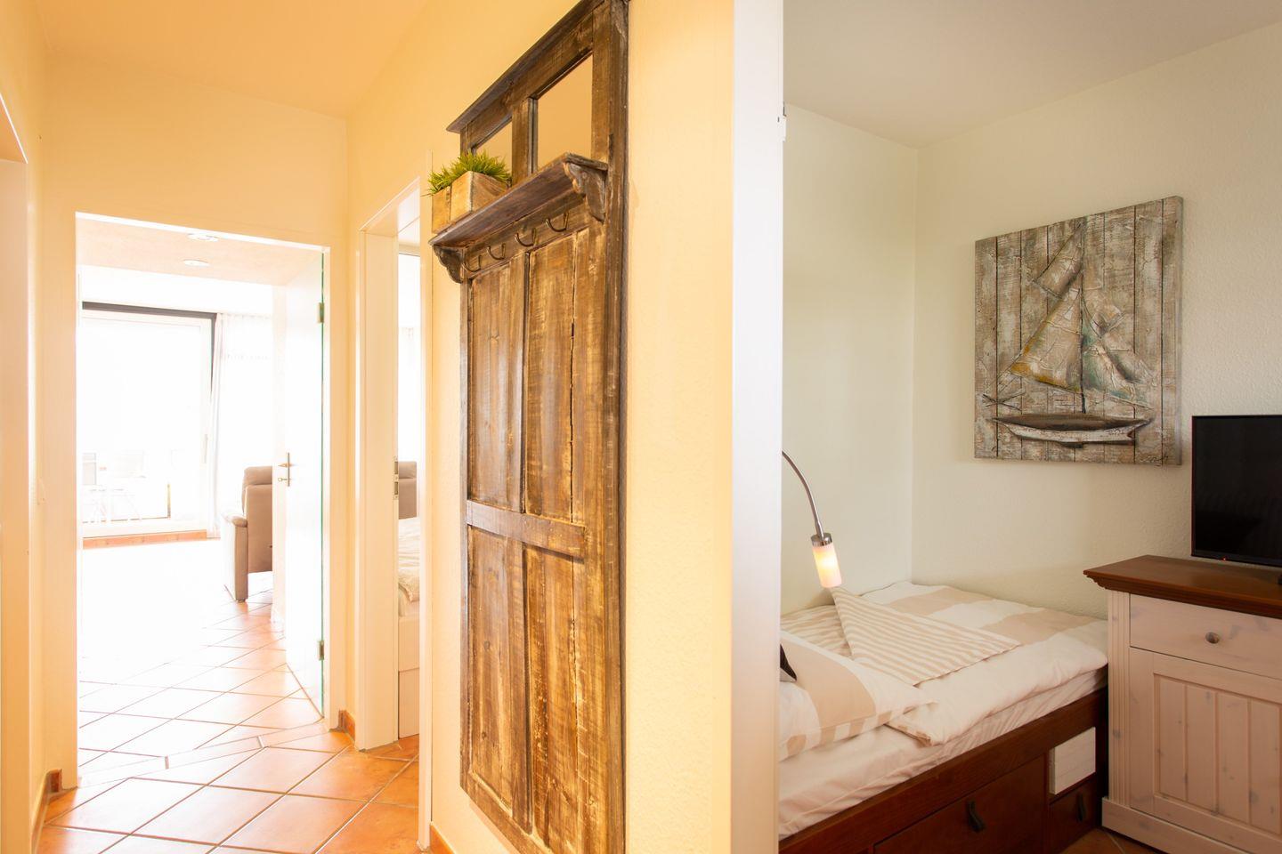 Zu Ihrer Linken kommen Sie in die Küche mit Cerankochfeld, Dunstabzugshaube, Geschirrspülmaschine, Kühlschrank mit Gefrierfach, Mikrowelle, Wasserkocher, Toaster, Kaffeemaschine und viele weitere nützliche Küchenhelfer. Gegenüber der Küche finden Sie das erste separate Schlafzimmer mit zwei Einzelbetten (90x200 cm), Sideboard und einen wandhängenden TV. Neben der Küche befindet sich das moderne Duschbad mit Waschtisch und Spiegel. Zurück auf den Flur geht es weiter in den Wohnbereich.