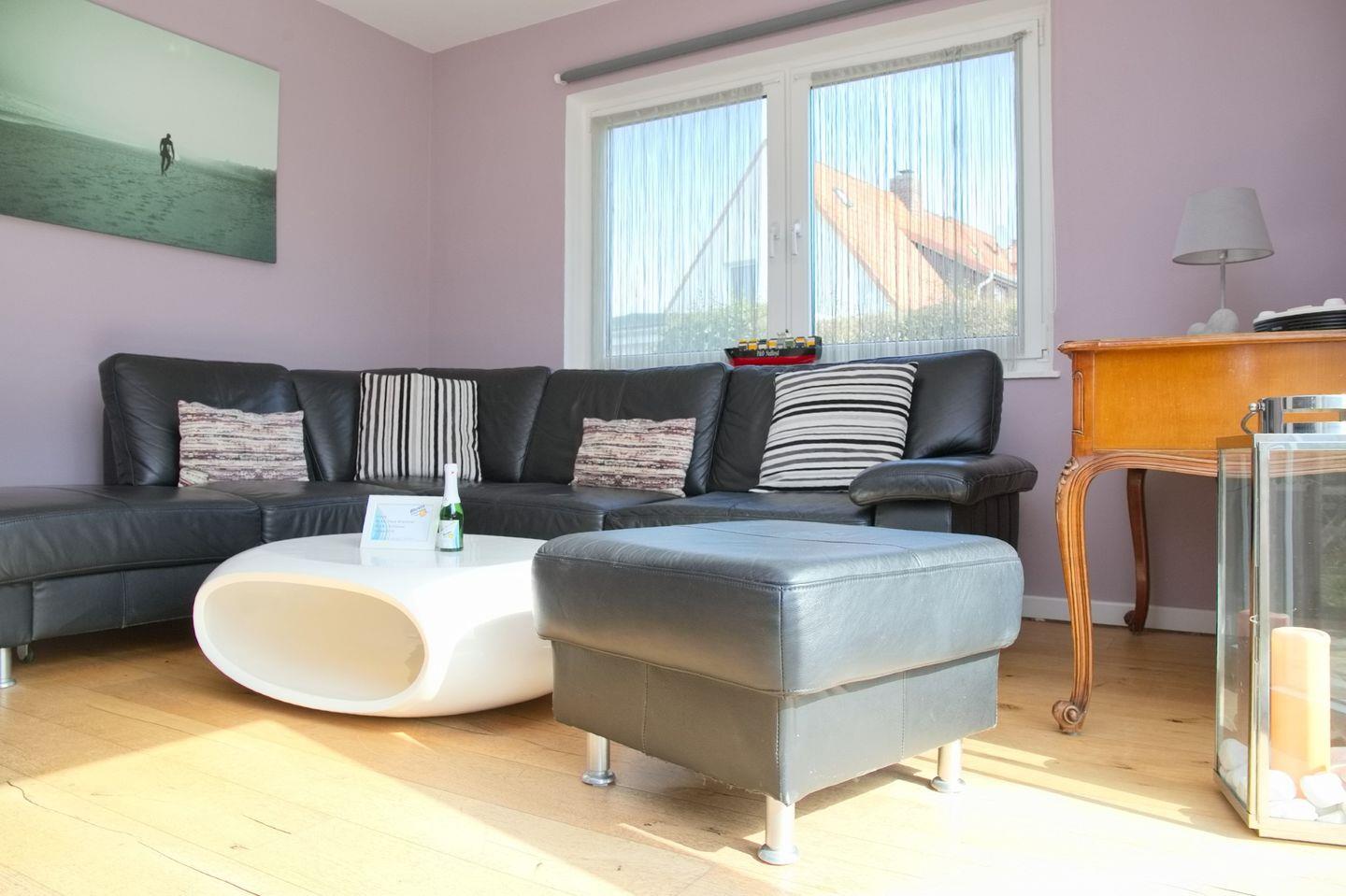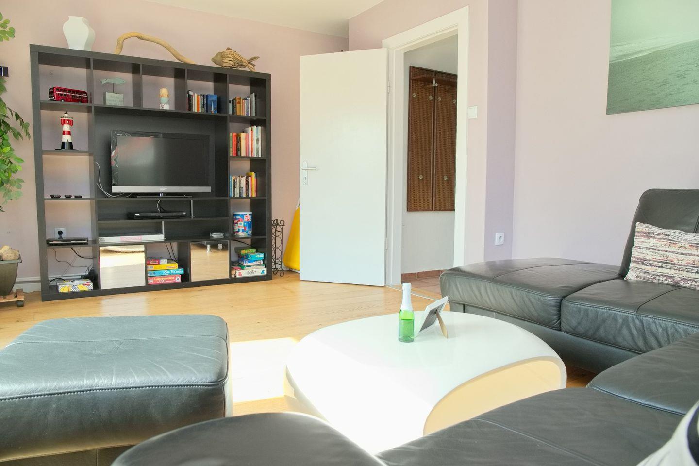 im hellen Wohnzimmer, das sich im Erdgeschoss befindet, gibt es eine Ledergarnitur, einen Flat-Screen, DVD- Player, Radio, einen Holzfußboden und einen Zugang zum eingezäunten Garten ( Höhe 50 cm, nicht durchgehend ) mit möblierter Terrasse und Grill.