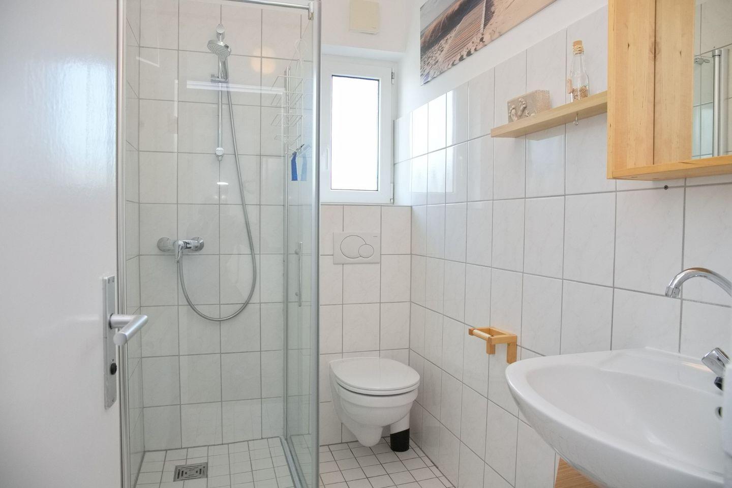 Das weiß geflieste Badezimmer hat eine ebenerdige Dusche sowie ein WC.