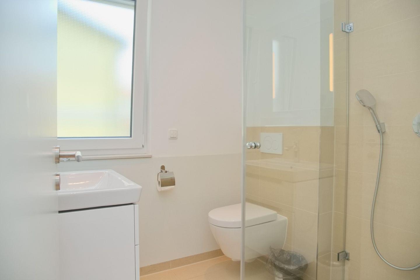 Ihre moderne Design-Küche im edlen Weiß verwöhnt Sie mit Cerankochfeld, Mikrowelle, Backofen, Geschirrspüler sowie einer Kaffeemaschine, Wasserkocher und Toaster. Ihr Bad bietet Ihnen eine ebenerdige Dusche, WC und Waschtisch. Ein beheizter Handtuchhalter versteht sich von selbst.