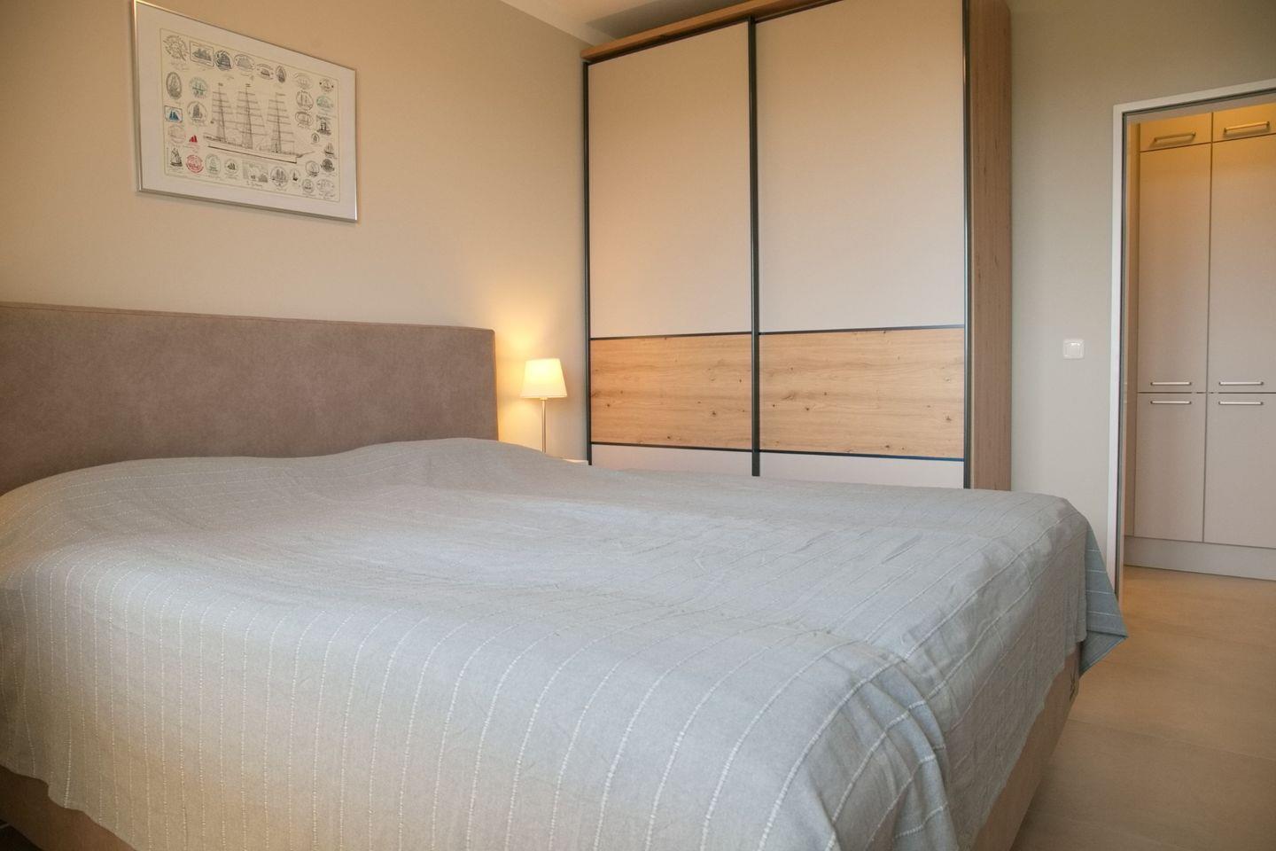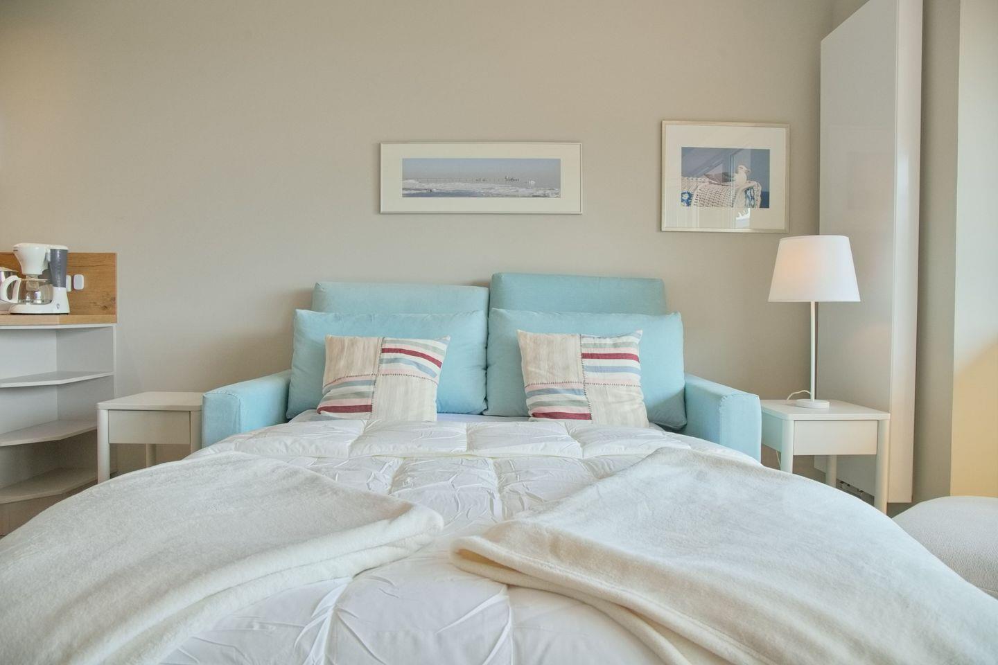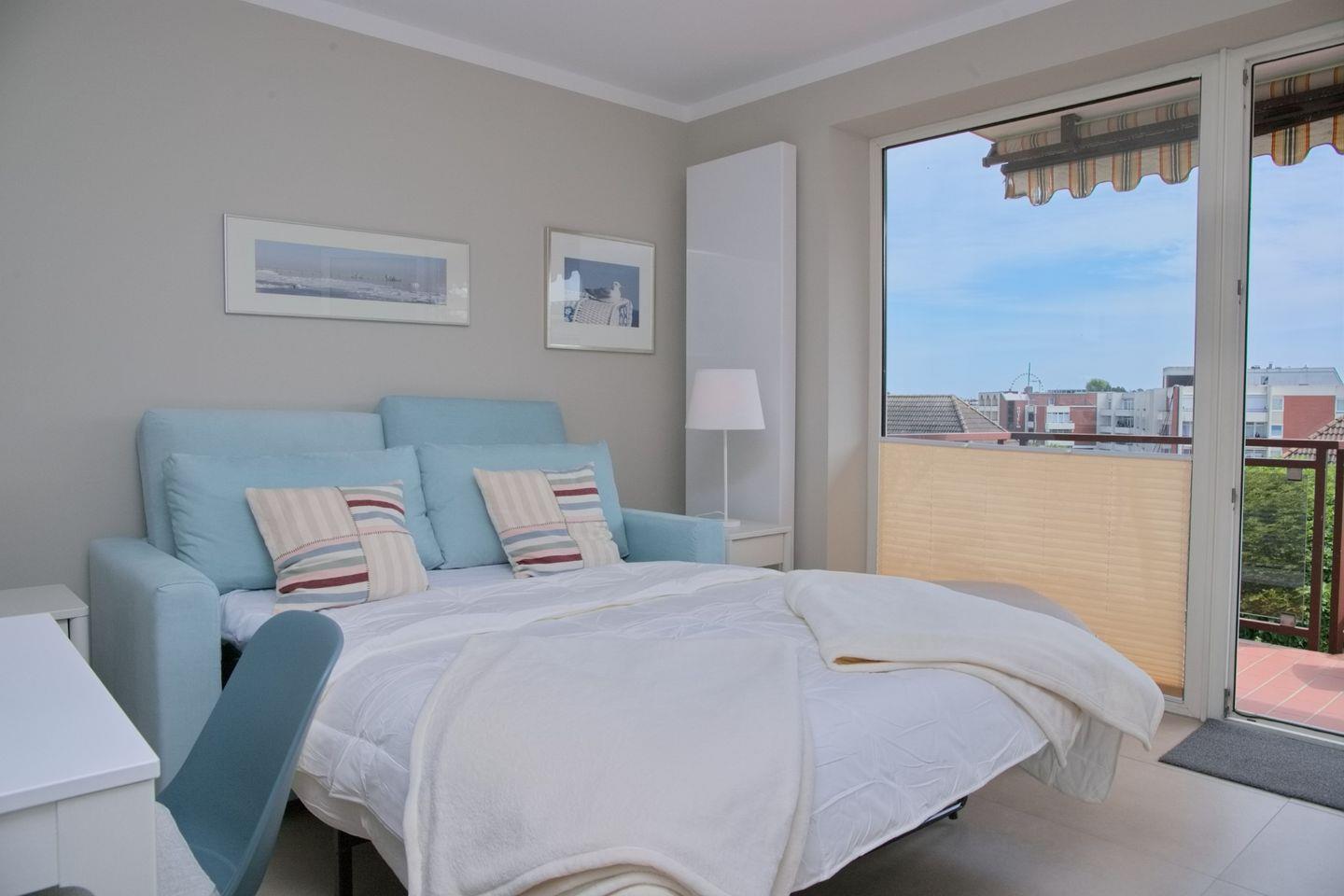 Im Schlafzimmer erwartet Sie ein großzügiges Boxspringbett (180x200 cm) mit durchgehendem Topper für erholsamen Schlaf. Ein geräumiger Schwebetürenkleiderschrank bietet ausreichend Stauraum für Ihre Garderobe. Besonders praktisch: Vom Schlafzimmer aus haben Sie, ebenso wie vom Wohnzimmer, direkten Zugang zum möblierten Balkon, der mit einer Markise ausgestattet ist. Hier können Sie den schönen Meerblick genießen und die frische Ostseeluft in vollen Zügen auskosten.