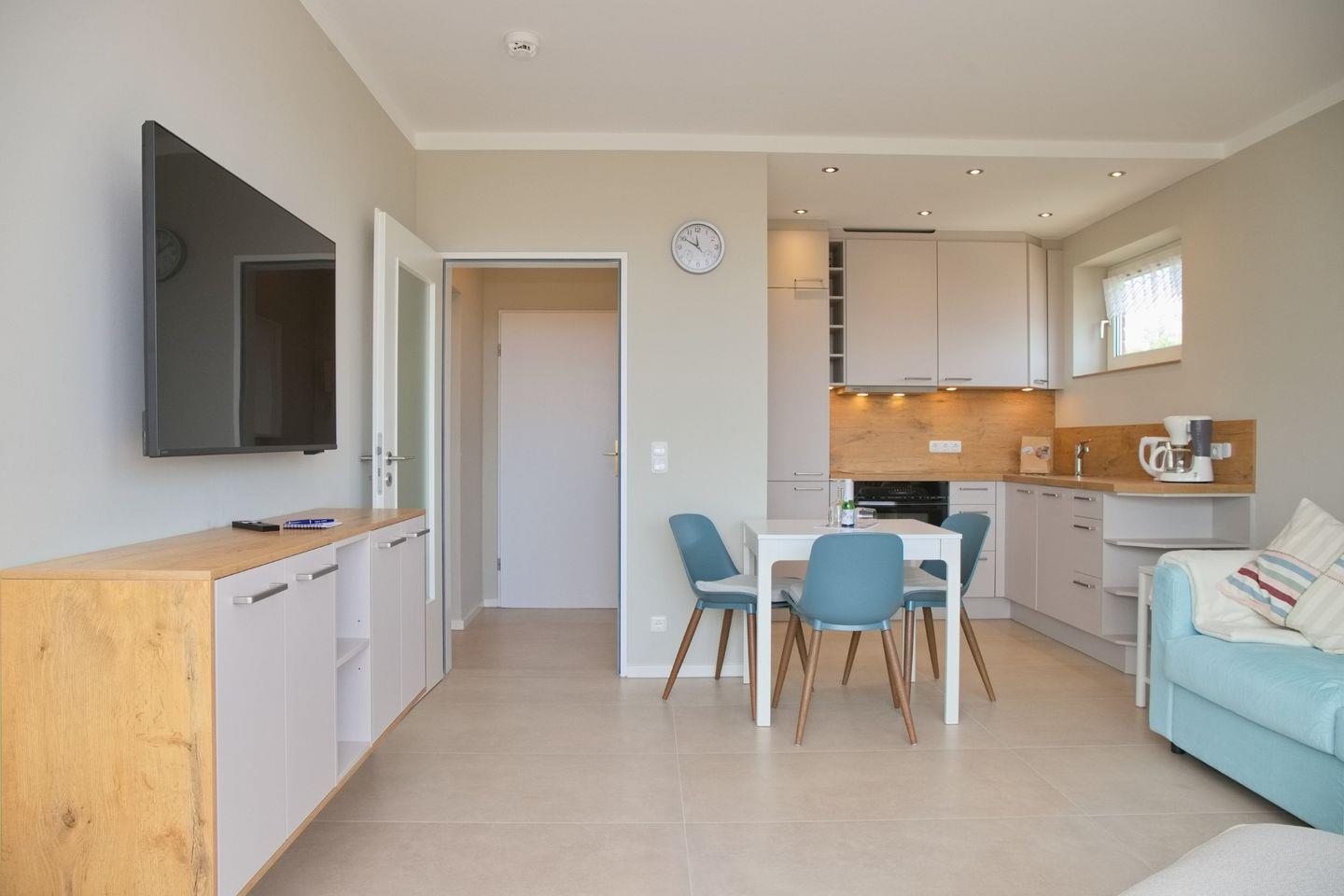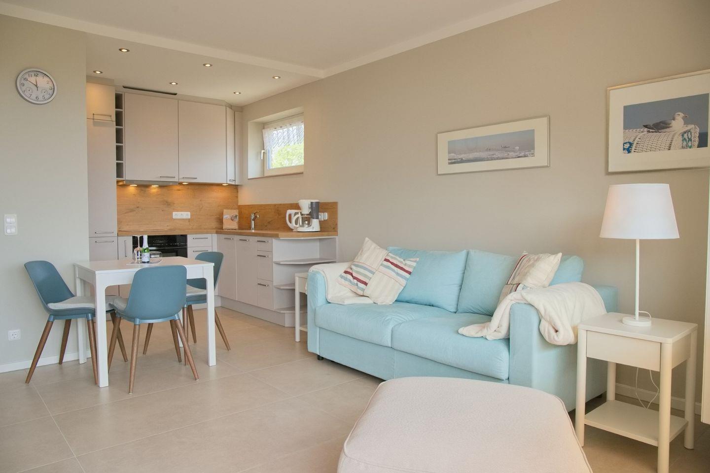 Das gemütliche Wohnzimmer ist mit einer komfortablen Schlafcouch ausgestattet, die eine Liegefläche von 140x200 cm bietet. Ein Flachbildfernseher sorgt für Unterhaltung und Entspannung nach einem langen Tag am Strand. Der Essbereich bietet Platz für 4 Personen und ist ideal für gemeinsame Mahlzeiten und gesellige Abende.