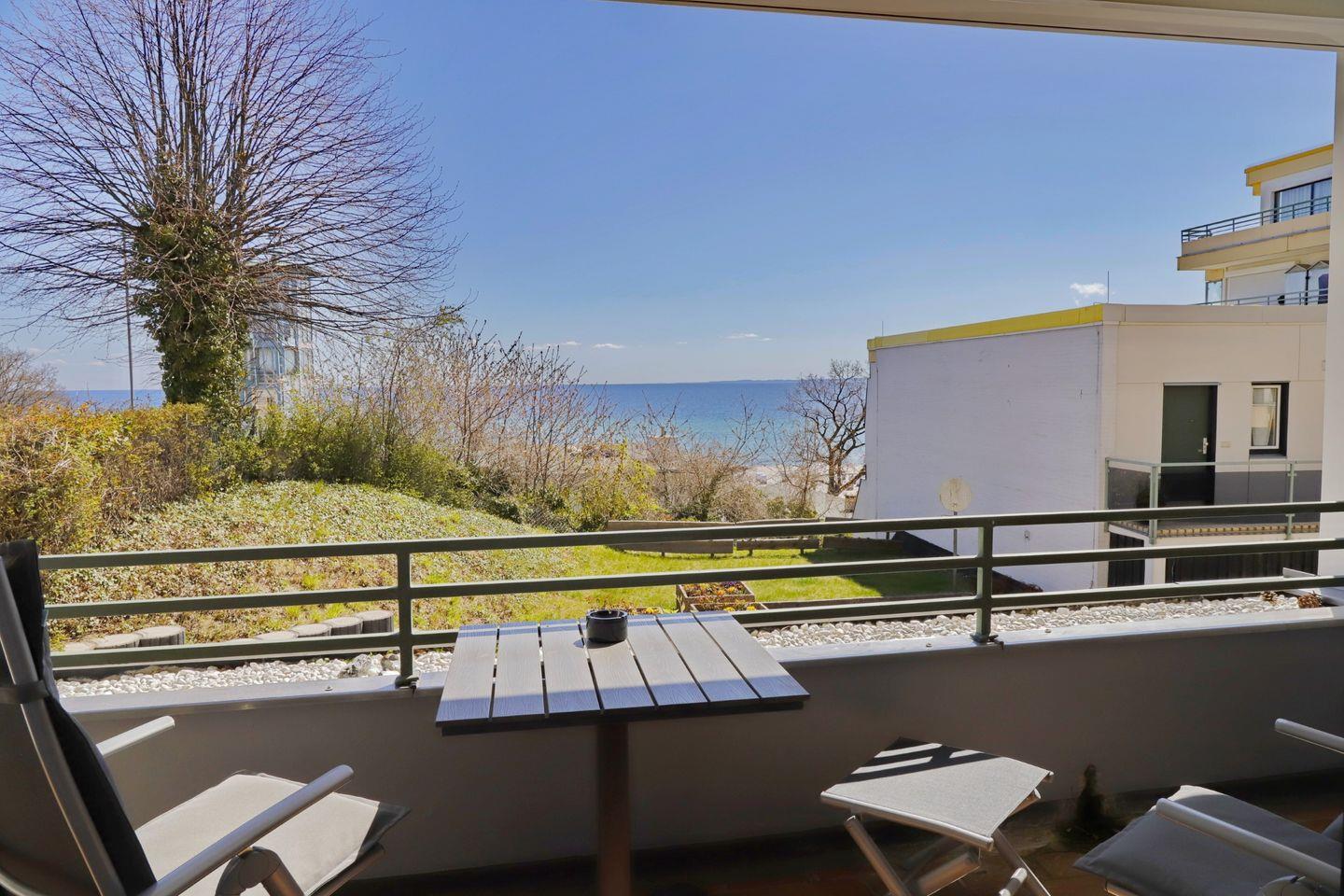 Der windgeschützte, große Balkon ist mit einem Tisch und vier Hochlehnern und zwei Fußhockern, sowie einer Markise ausgestattet. Der wunderbare Meerblick lädt zum Verweilen und Entspannen ein.