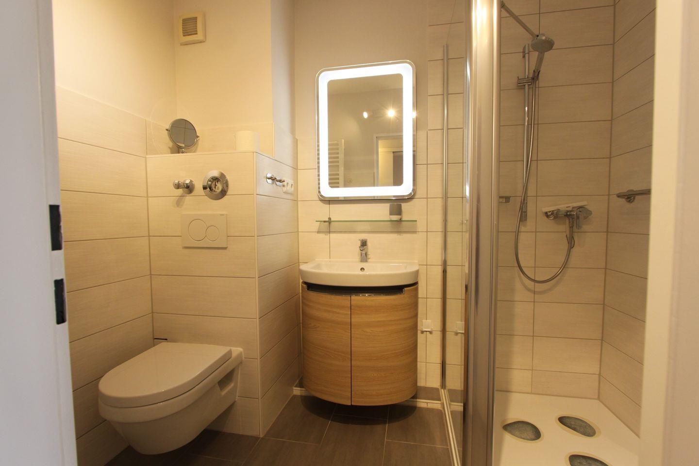 Ein modernes Badezimmer ist mit einem Handtuchheizkörper, einem Waschtisch mit Stauraum für Ihre Kosmetika und Spiegelschrank ausgestattet.