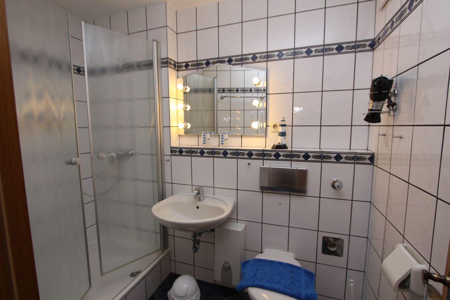 Bad hat eine Dusche, ein WC, ein Waschbecken, ein Fön, Kosmetikspiegel und