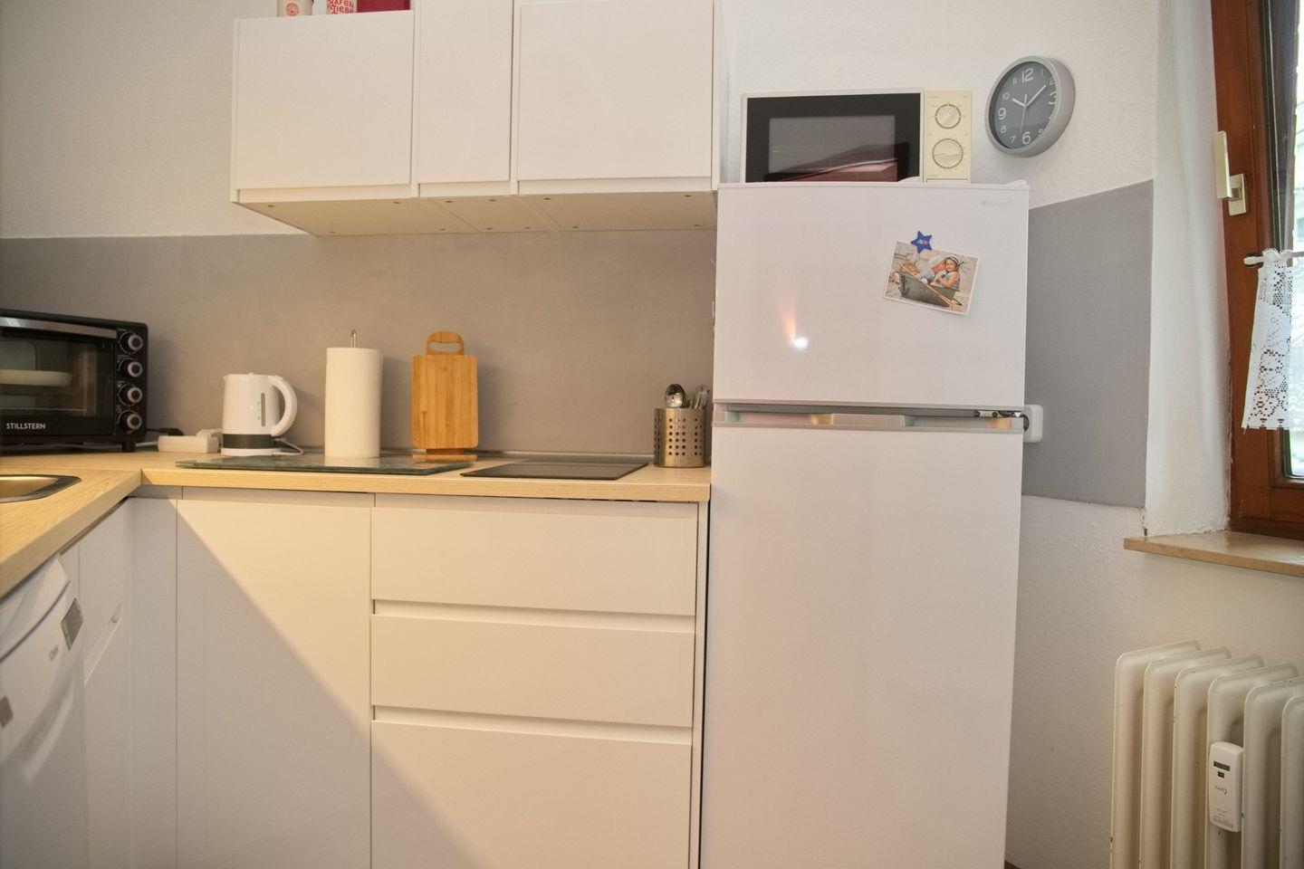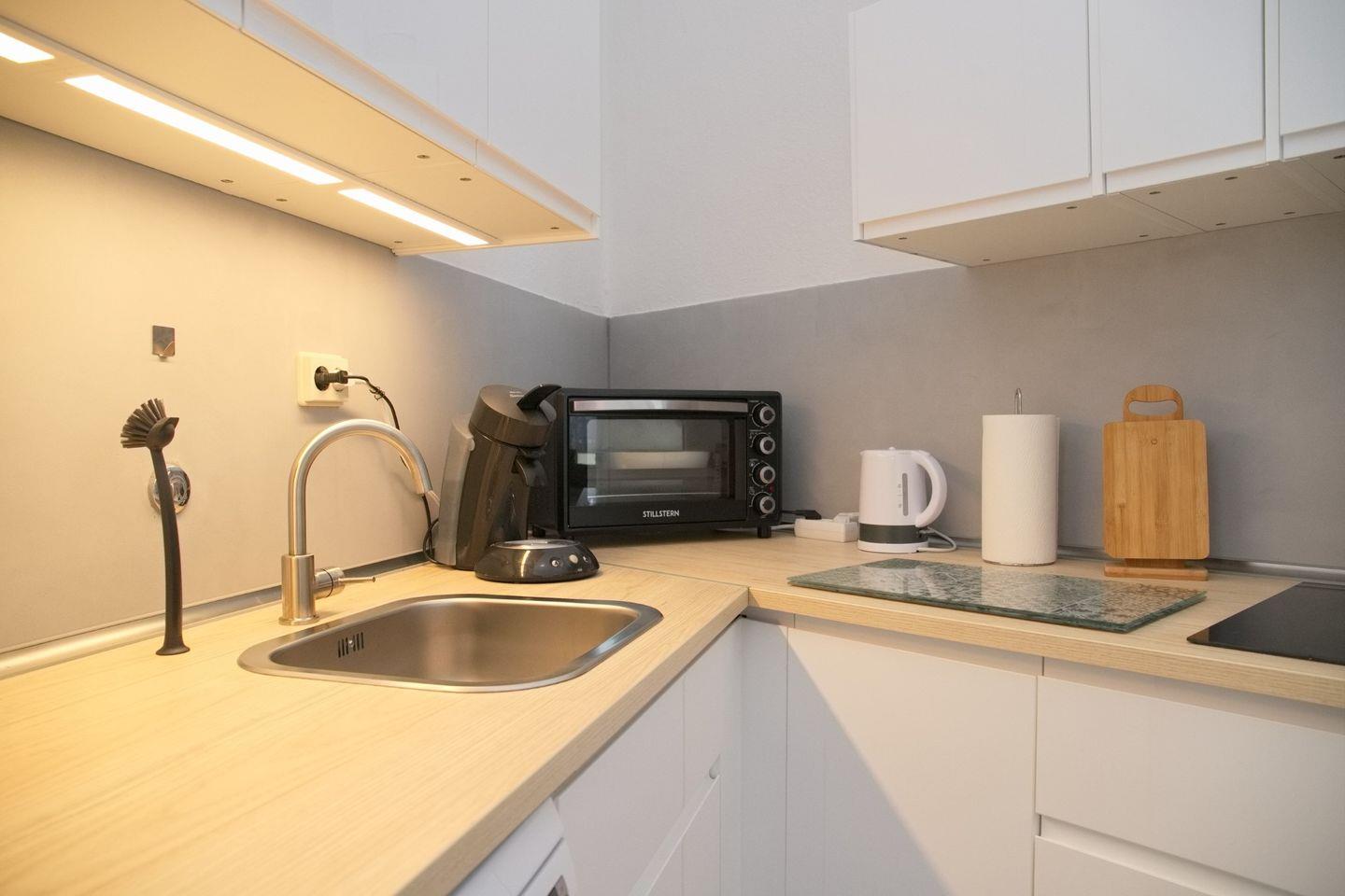 Separate Einbauküche mit einem 2- Platten- Induktionsherd und Mini- Backofen, Mikrowelle, Kühlschrank mit Gefrierfach, Spülmaschine und einer Senseo- Padmaschine.