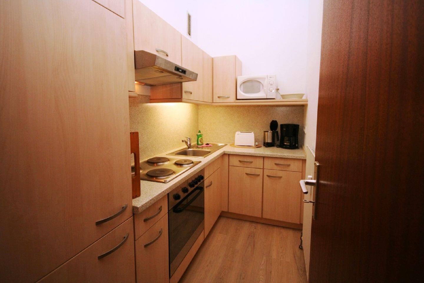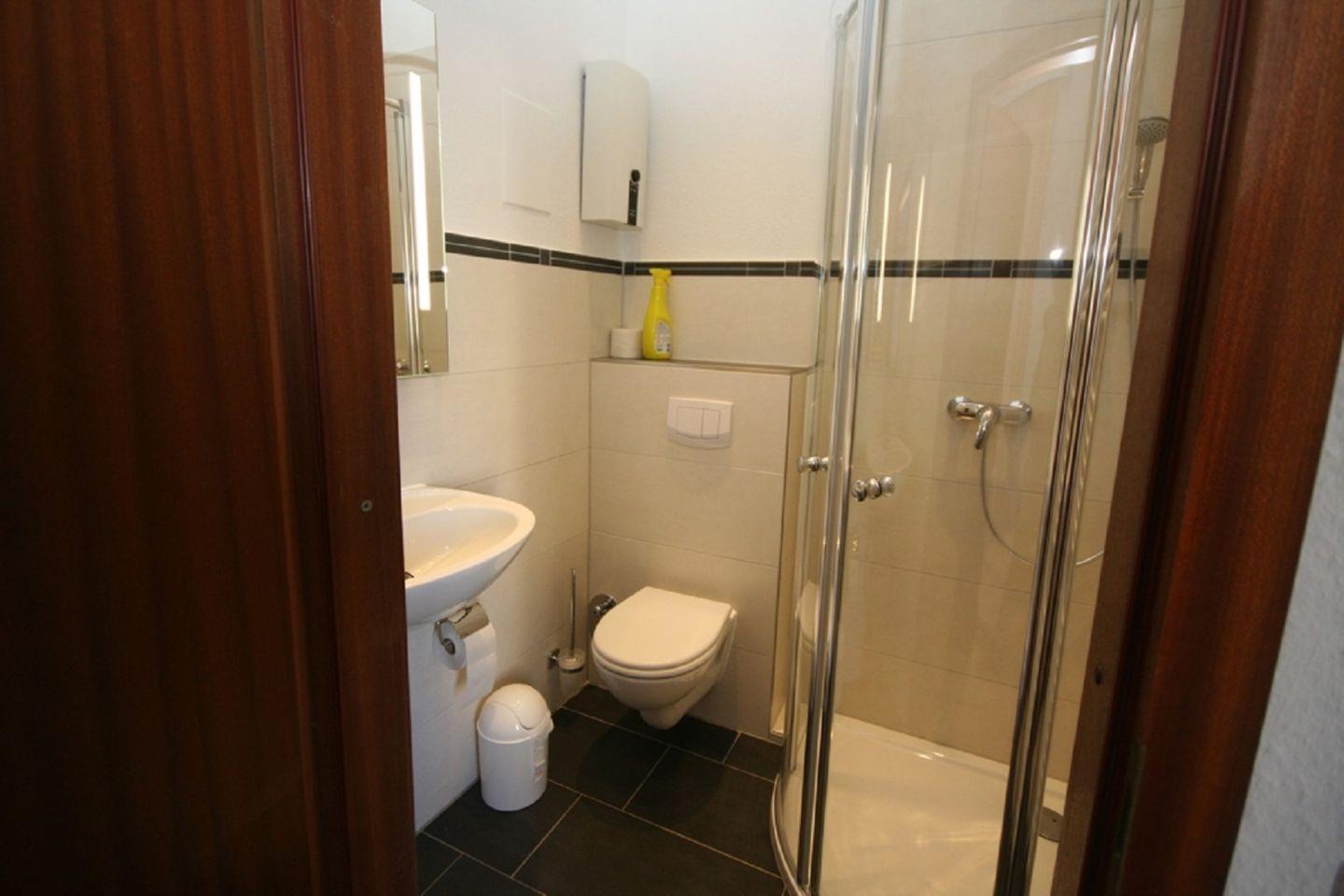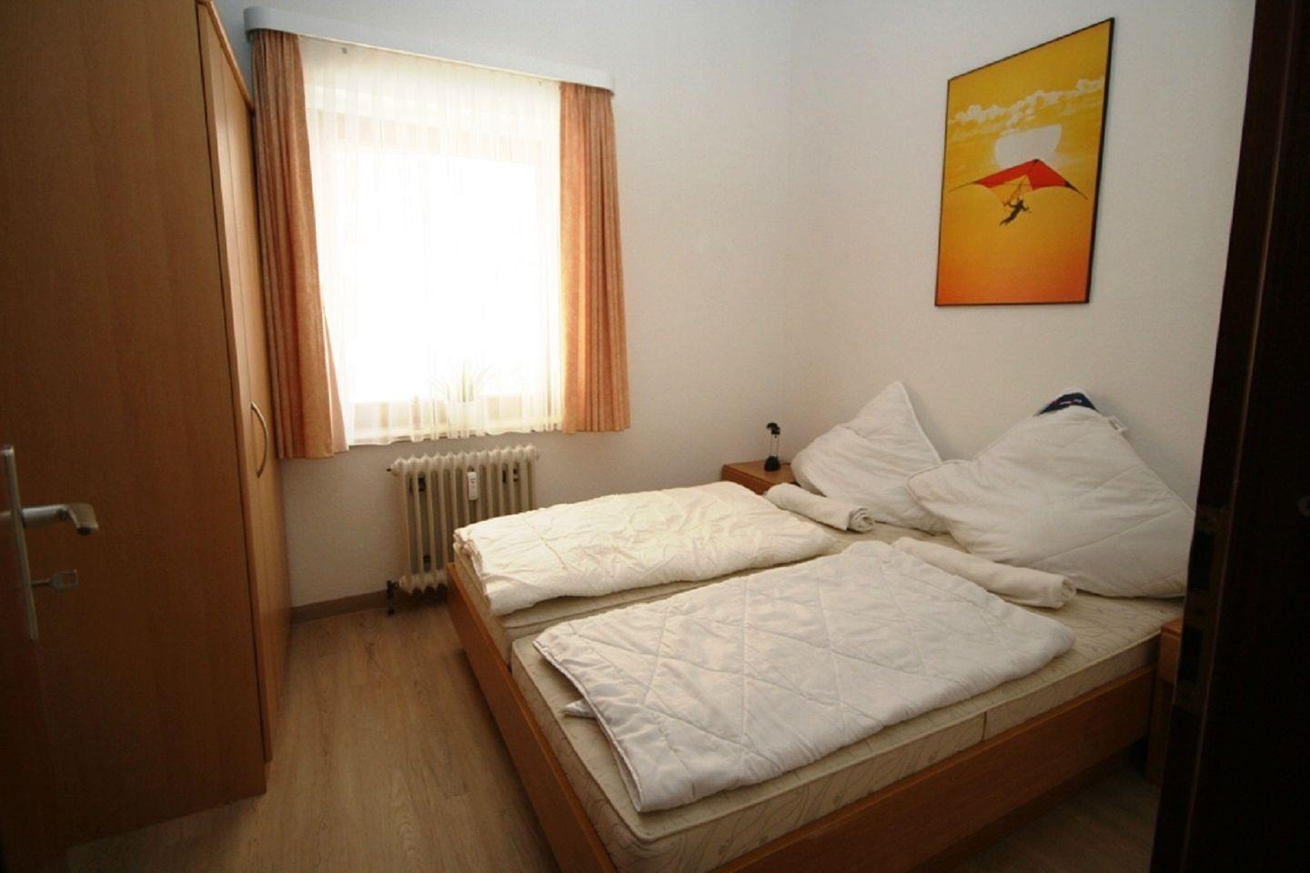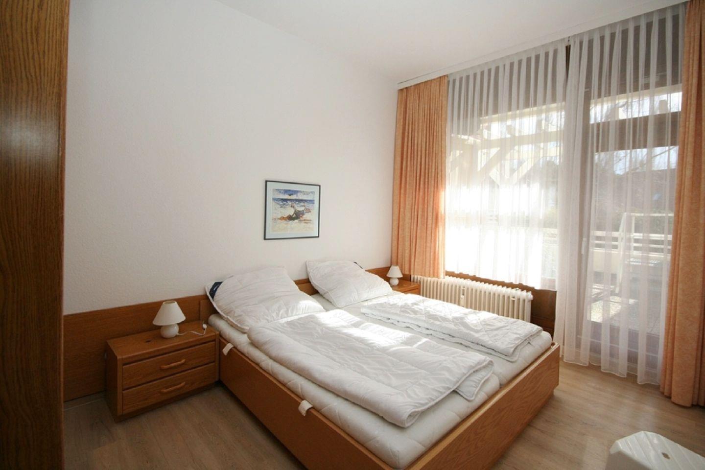 Schöne 3-Zimmer-Wohnung, ca. 63 qm, in der 1. Etage einer gepflegten Appartementanlage, mit Süd-Westbalkon. Vom Flur gelangen Sie über 3 Stufen in das helle Wohnzimmer, dort stehen eine Schlafcouch für die 5. Person und 2 Sessel, ein Flatscreen, ein Radio und eine Essecke mit 5 Stühlen. Von hier gelangen Sie auf den möblierten Balkon und auf die Terrasse, welche auch von einem der Schlafzimmer begehbar ist. Die Küche ist mit einem 4-Plattenherd mit Backofen, Kühlschrank mit Gefrierfach, einer Mikrowelle, Kaffeemaschine und Toaster ausgestattet. In beiden Schlafzimmern befinden sich ein Doppelbett mit 2 Nachttischen und ein Kleiderschrank. Die Wohnung ist mit Vinylboden in Holzoptik ausgelegt. Die Wohnung verfügt über ein modernes neues Duschbad/WC.