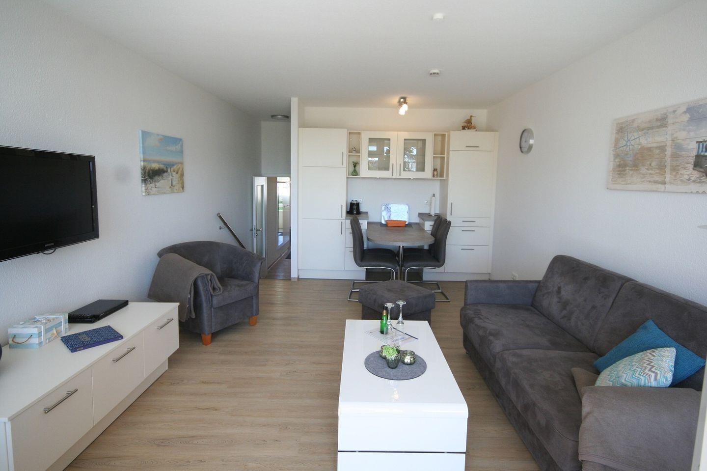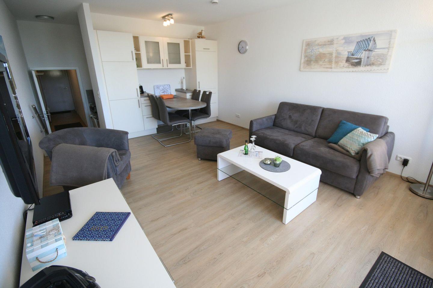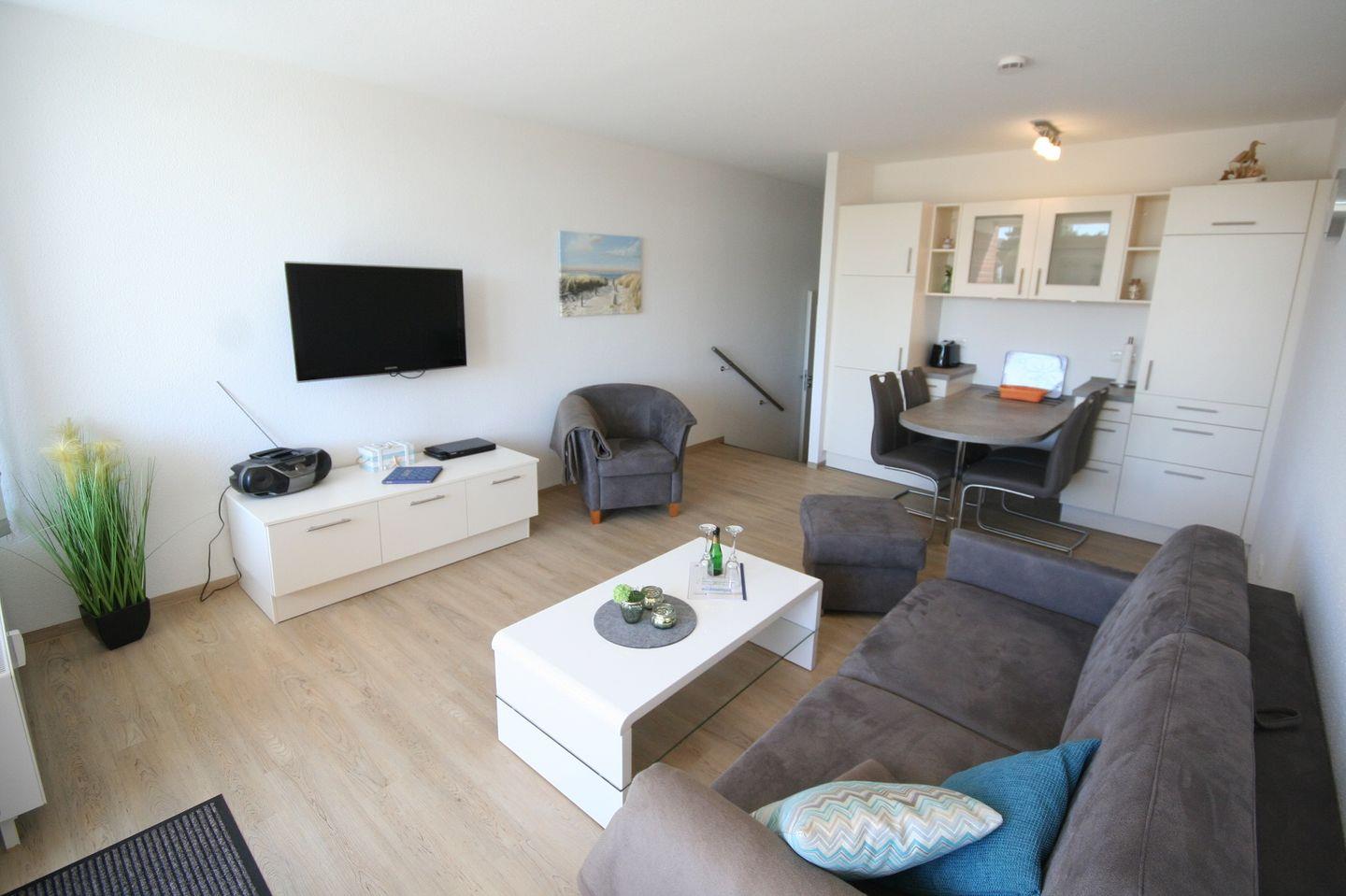 Sehr geschmackvoll und modern eingerichtete 2-Zimmer-Wohnung (52²) in der ersten Etage einer gepflegten Appartementanlage mit möbliertem Balkon in Südlage. Im Wohnzimmer, welches Sie vom Flur über 3 Stufen erreichen, gibt es eine hochwertige Schlafcouch für 1 Person, einen Sessel,einen Flatscreen, einen Blu-ray Player und ein Radio mit CD- Player .