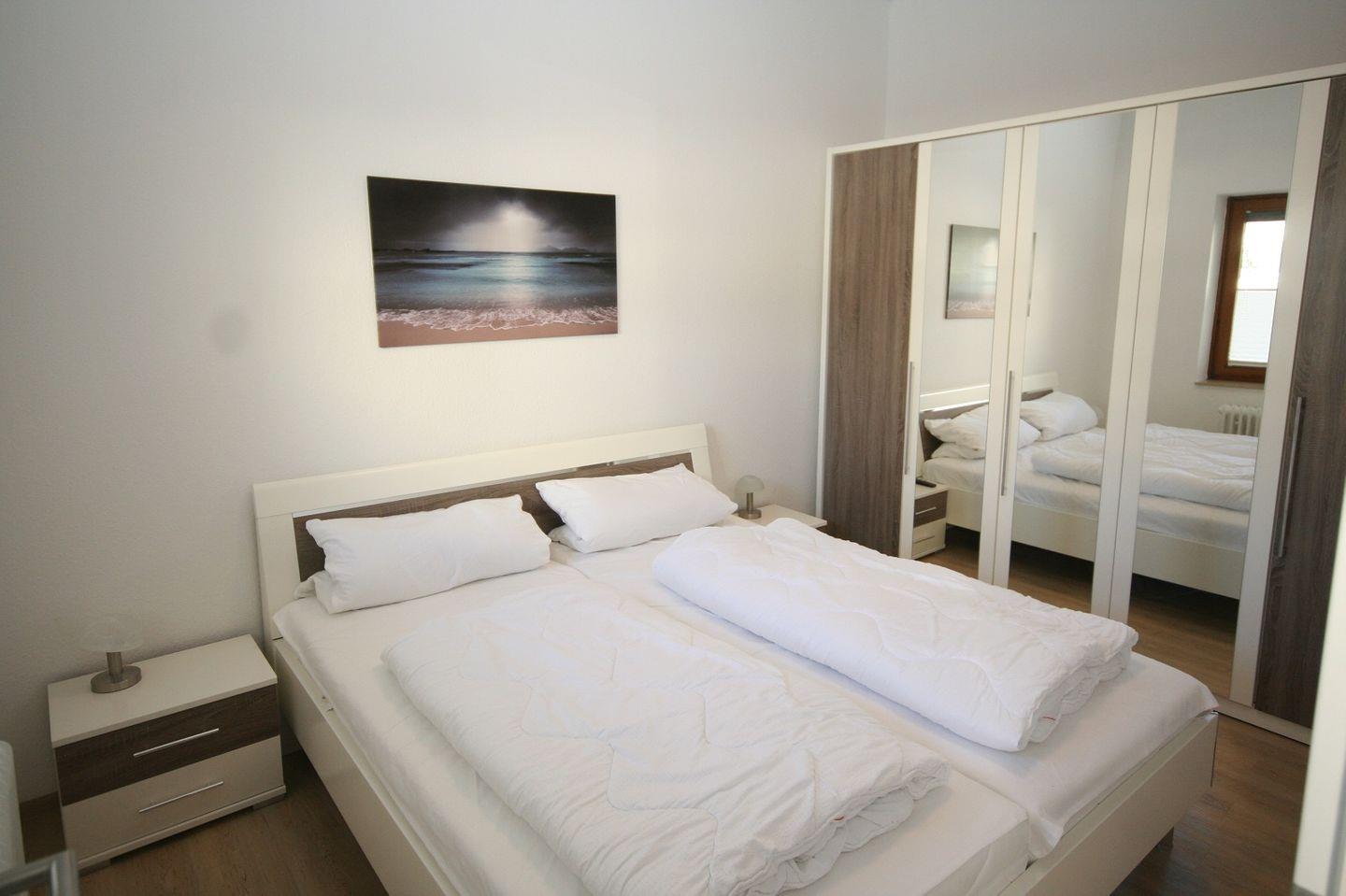 Im Schlafzimmer befinden sich ein Doppelbett, ein Kleiderschrank, 2 Nachttische und ein zusätzlicher großer Flatscreen.