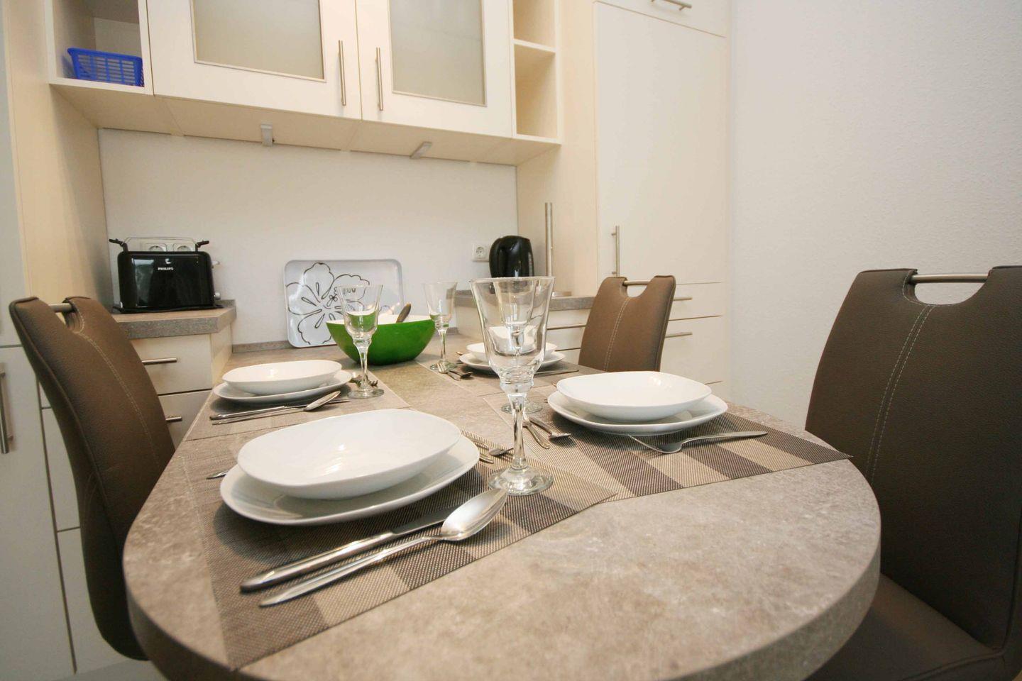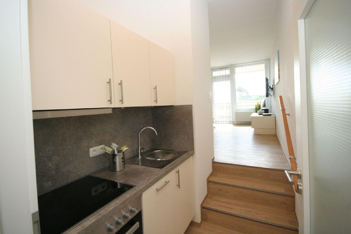 Die offene, modern gestaltete Küchenzeile zwischen dem Flur und dem Wohnzimmer ist mit einem Ceranfeld mit Backofen, einem Kühlschrank mit einem Gefrierschrank, einer Geschirrspülmaschine, einer Kaffeemaschine sowie einer Senseo- Padmaschine, einem Wasserkocher sowie einem Toaster ausgestattet. Ein Essbereich ist hier integriert.