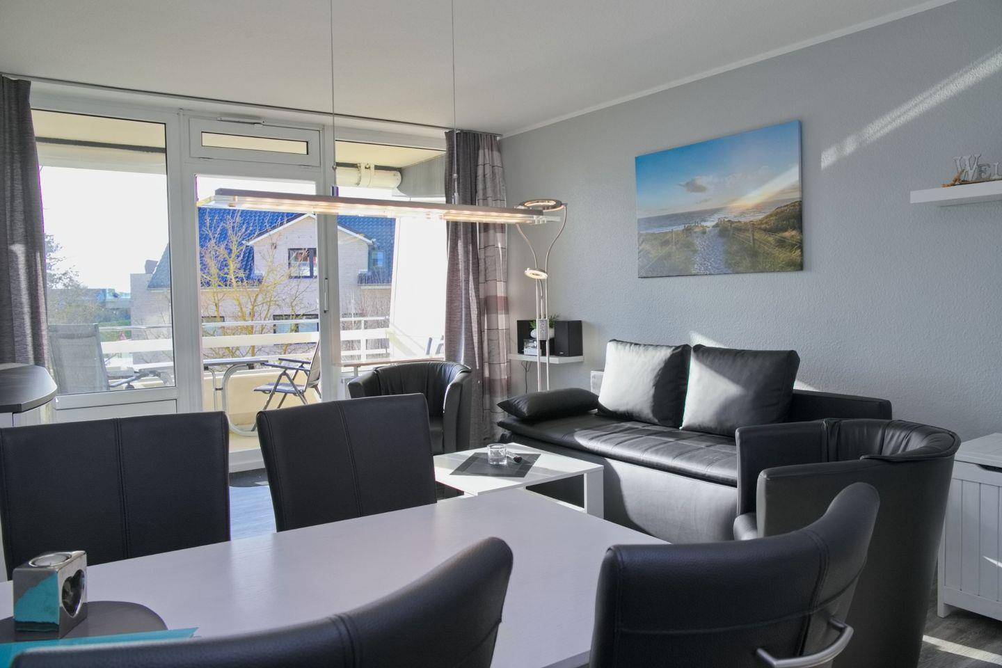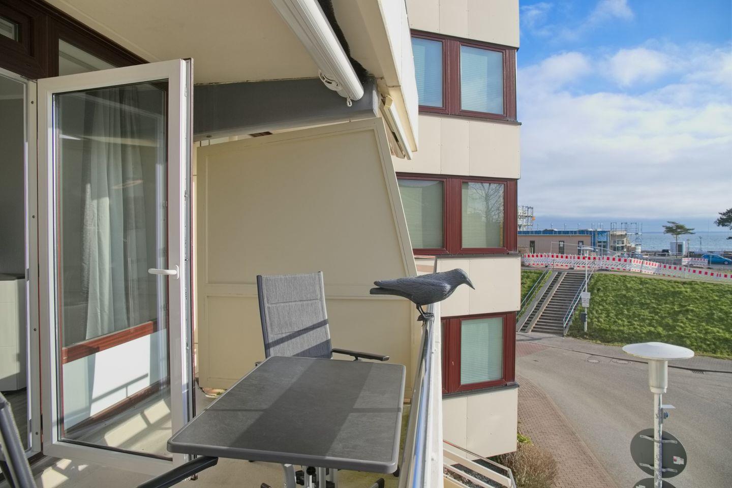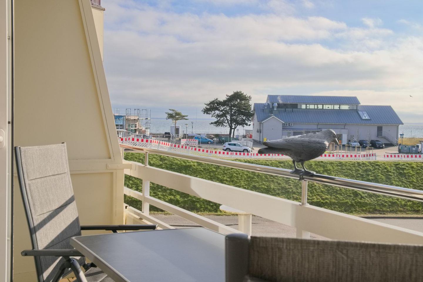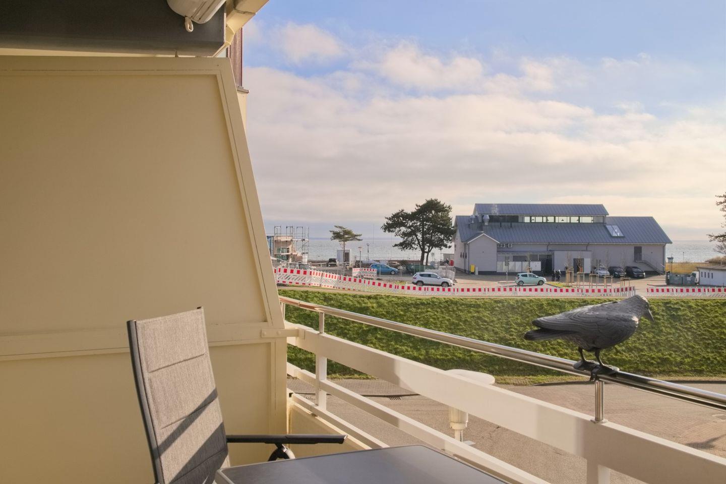 Vom Wohnbereich aus betreten Sie Ihren wunderschönen, möblierten Süd-/ Westbalkon mit Blick über den Deich zur Ostsee. Die Sonne können Sie hier bis in die Abendstunden genießen.