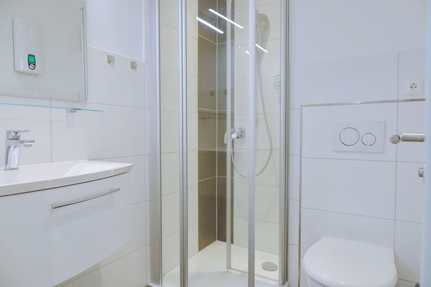 Das helle und moderne Bad verfügt über Eckdusche, WC und Waschtisch mit beleuchteten Spiegel.