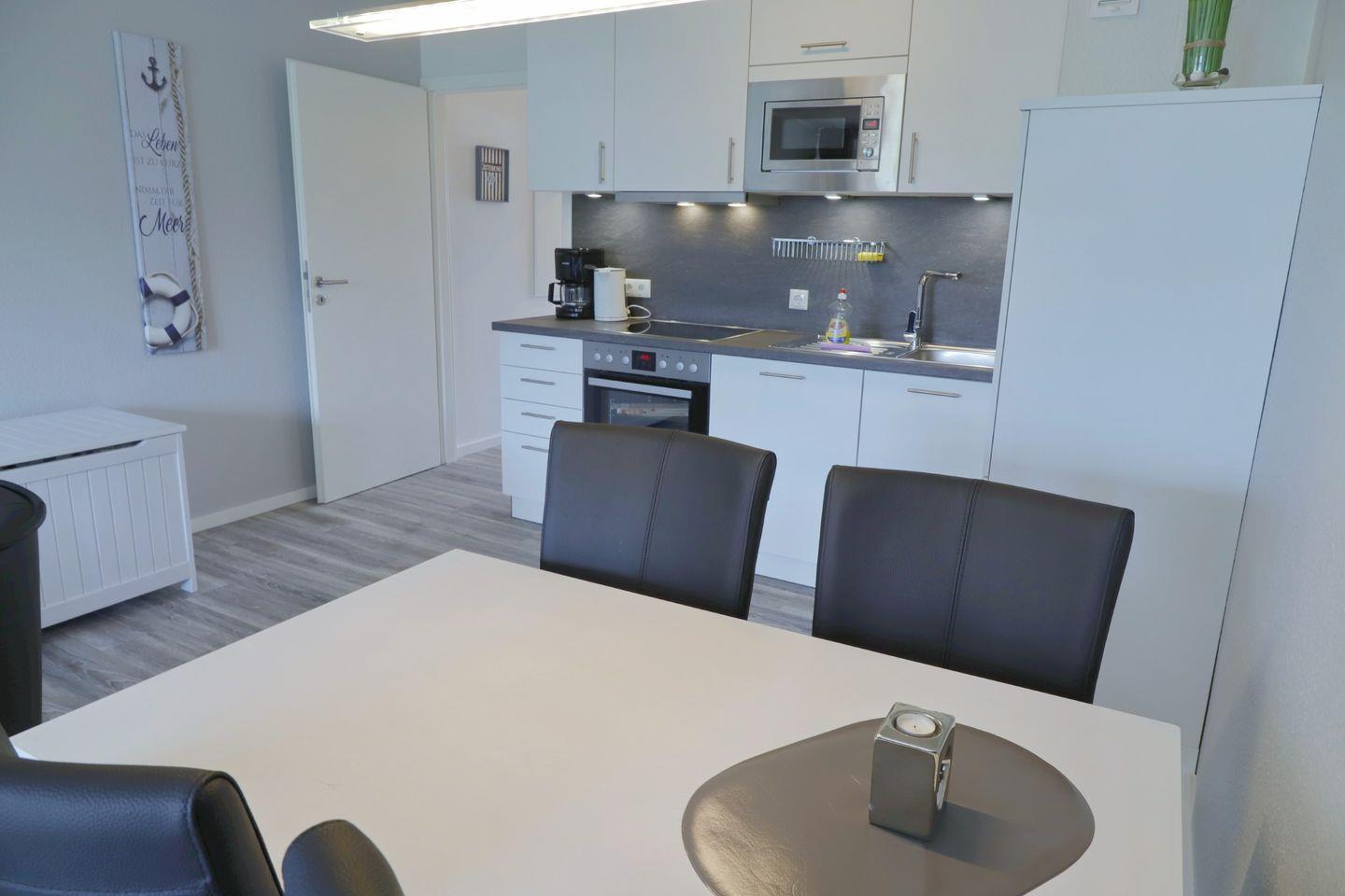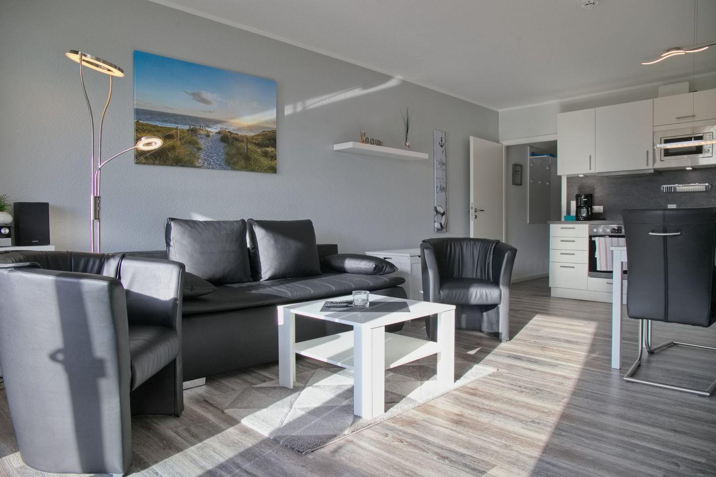 Der helle und modern gestaltete Wohnraum des Domizils bietet Ihnen eine Schlafcouch mit zwei Sesseln, einen Essbereich für bis zu 4 Personen sowie eine offene Küche, die direkt an den Essbereich grenzt.