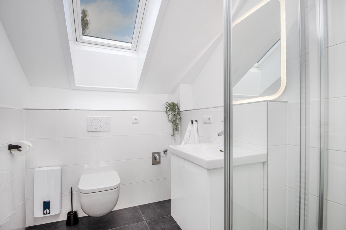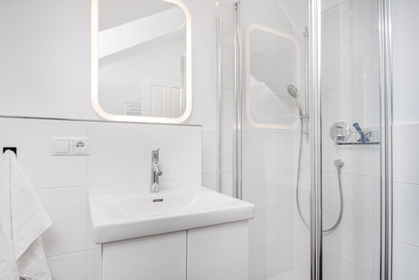 Das Badezimmer bietet eine großzügige Echtglas-Duschkabine mit Rainshower-Funktion, ein WC, einen Waschtisch, einen beleuchteten Spiegel und ein Fenster für eine angenehme Atmosphäre.