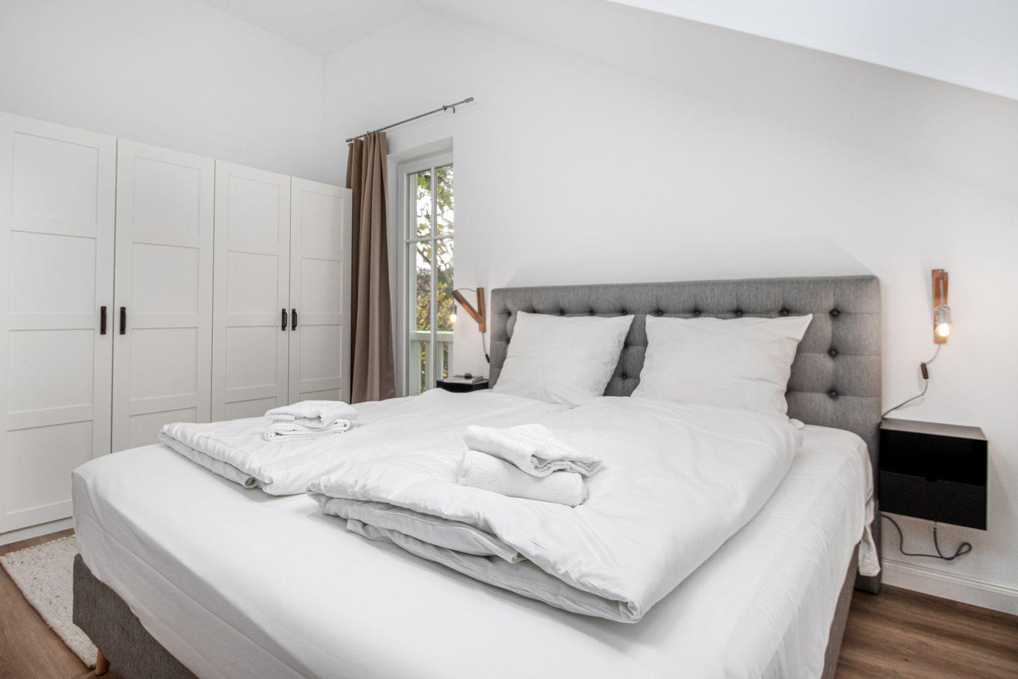 Das Schlafzimmer verfügt über ein luxuriöses Boxspringbett mit einem durchgehenden Topper für erholsame Nächte. Ein Smart-TV, ein geräumiger Kleiderschrank und Verdunkelungsgardinen runden das Angebot ab.