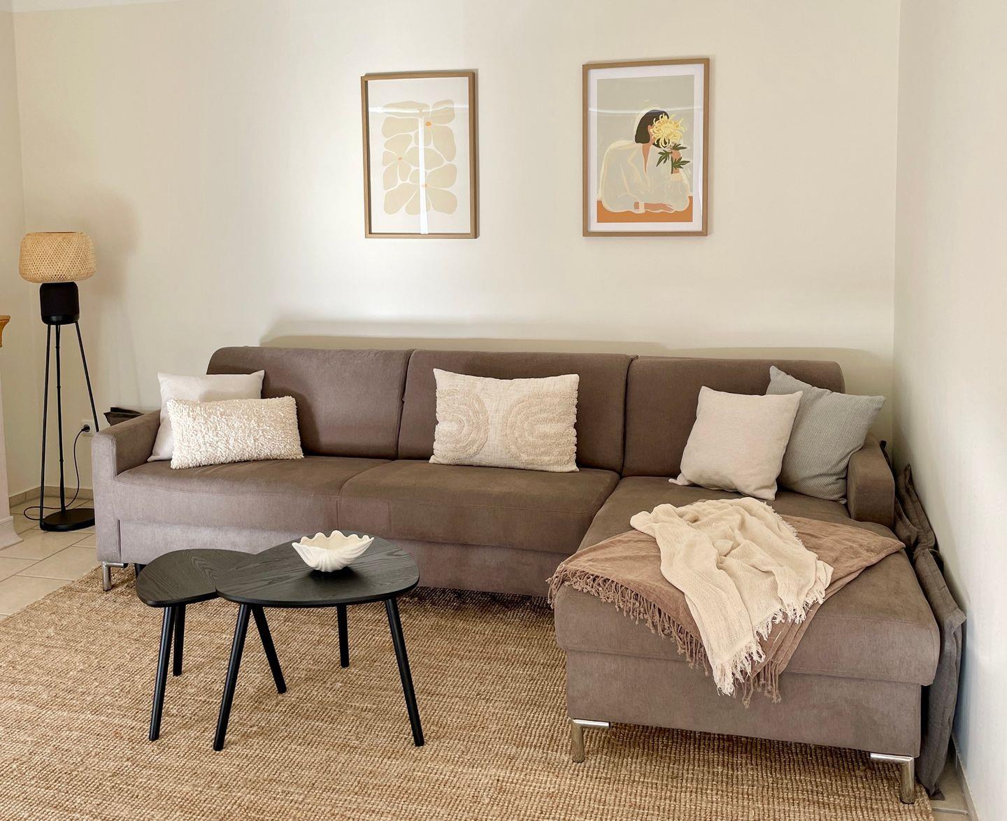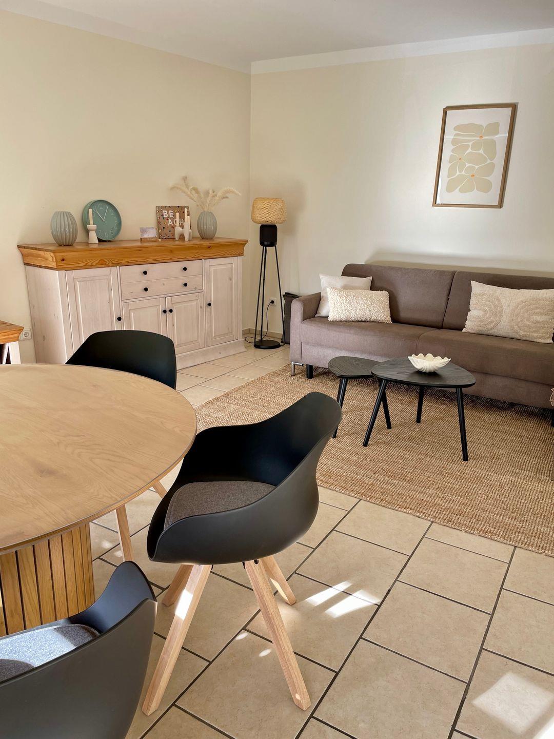 Der Wohnbereich des zentral, aber dennoch ruhig gelegenen Appartements bietet Ihnen eine Sofaecke und einen Essbereich für vier Personen. Schon beim Frühstück genießen Sie den herrlichen Ausblick auf die See. Die offene Küchenzeile ist mit allem ausgestattet, was man im Urlaub für die Zubereitung eines leckeren Frühstücks oder Abendessens gebrauchen kann. Die Couch im Wohnraum ist ausziehbar und somit auch als Schlafmöglichkeit nutzbar.