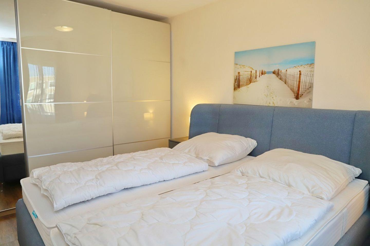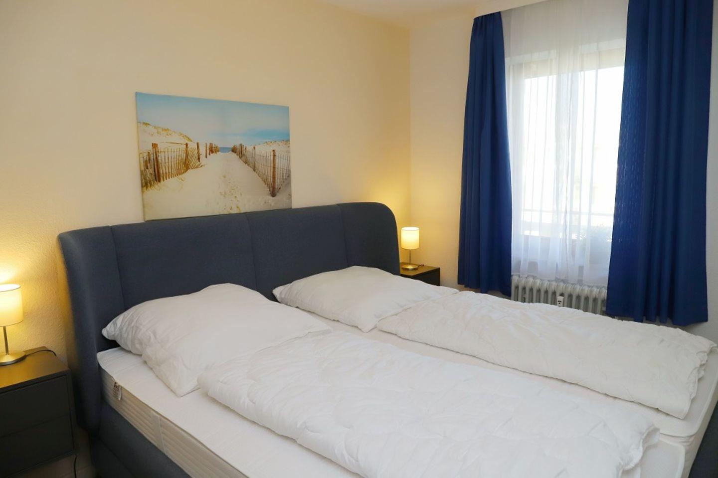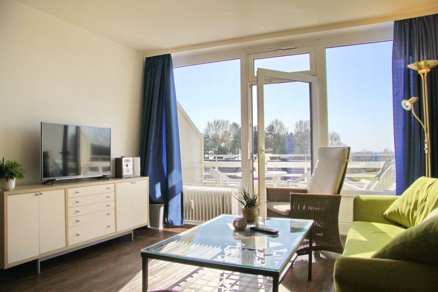 Sehr schöne 2-Zimmer-Wohnung (ca. 52 qm) in der 4. Etage mit möbliertem Balkon in Südwestlage mit Teilseeblick. Im Wohnzimmer gibt es eine Schlafcouch für 2 Personen, 2 separate Sessel mit Liegefunktion, ein TV, ein Radio mit CD-Player und eine Essecke mit 4 Stühlen an dem Sie bei einem ausgiebigen Frühstück Ihren Tag starten können. Von hier aus gelangen Sie auch auf den möblierten Balkon auf dem Sie die Mittagssonne bis in den Abend genießen können.
