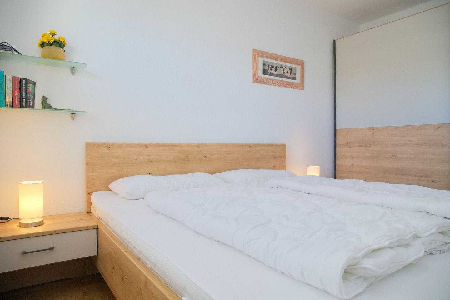 Die offene Küchenzeile ist mit einemCeranankochfeld mit Backofen, einem Kühlschrank mit Gefrierfach, einer Spülmaschine, einer Mikrowelle, einer Kaffeemaschine, einem Wasserkocher und einem Toaster ausgestattet. Im Schlafzimmer befinden sich ein Doppelbett(2x90x200), zwei Nachttische und ein Kleiderschrank. Die Wohnung verfügt über ein Duschbad/WC.