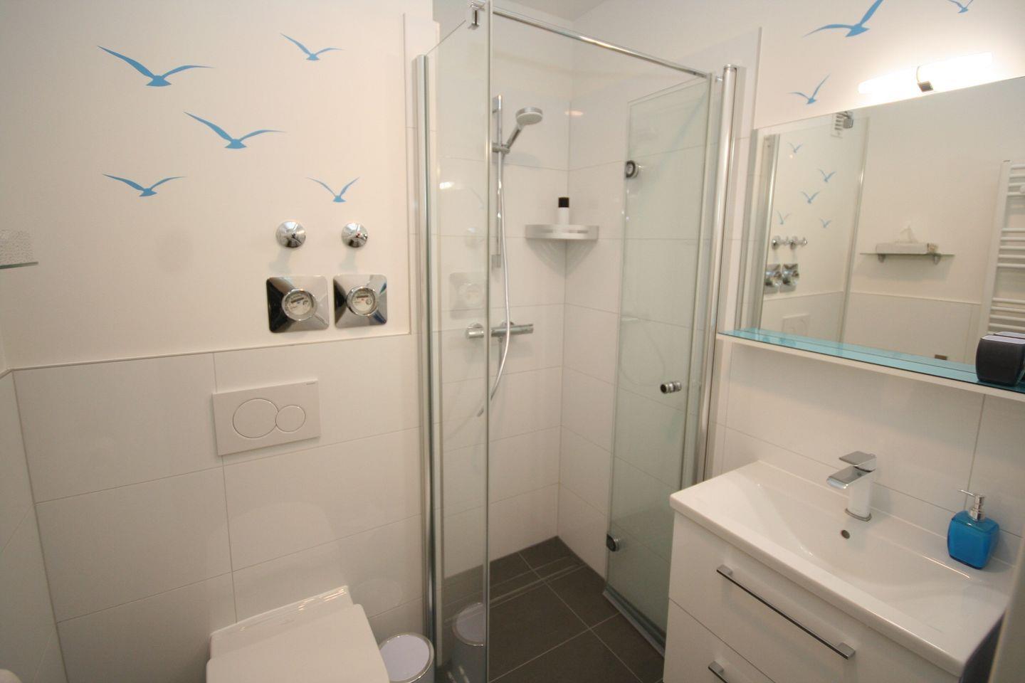 Gleich rechts kommen Sie in das Bad mit ebenerdiger Glasdusche, WC und Waschtisch mit beleuchtetem Spiegel.